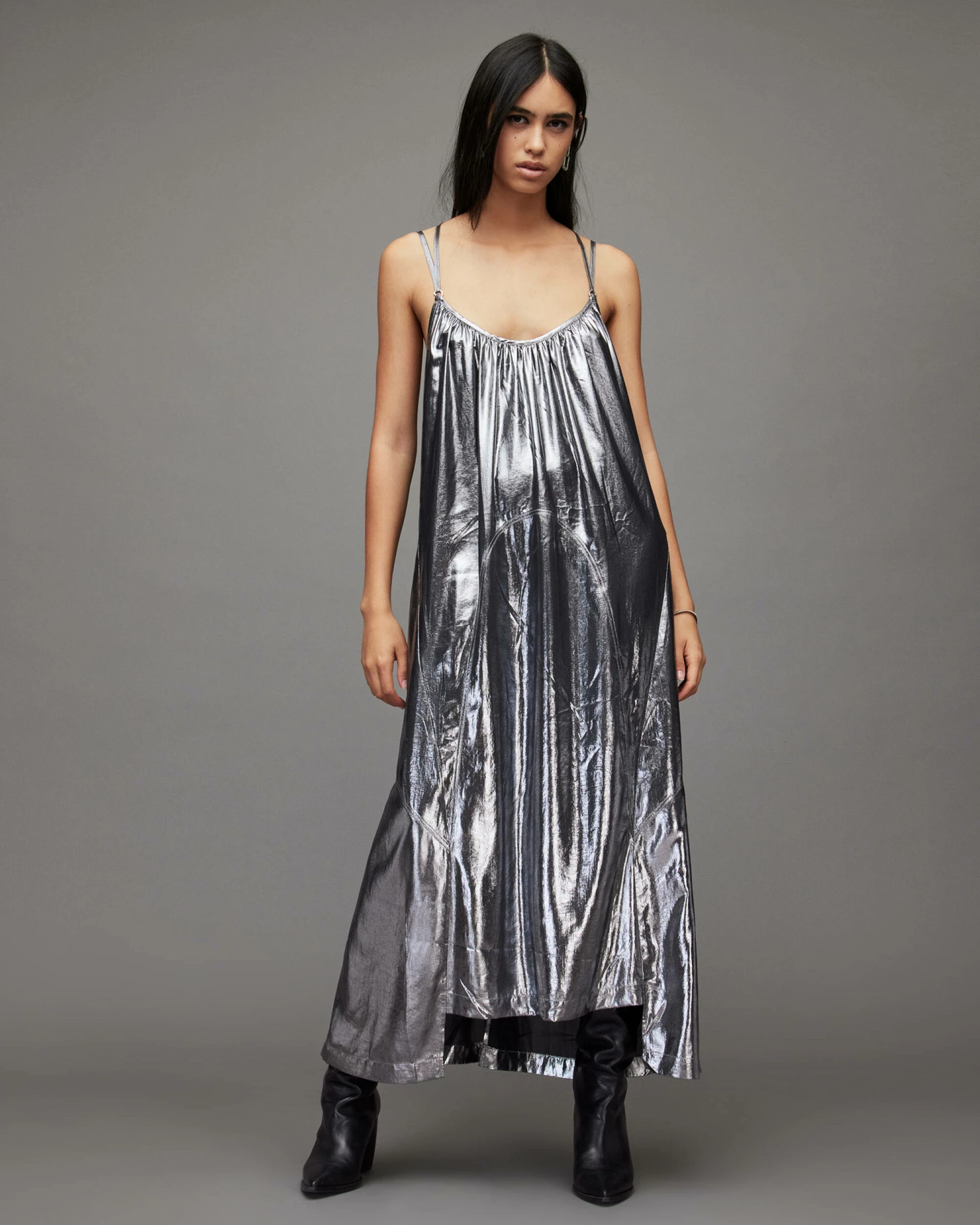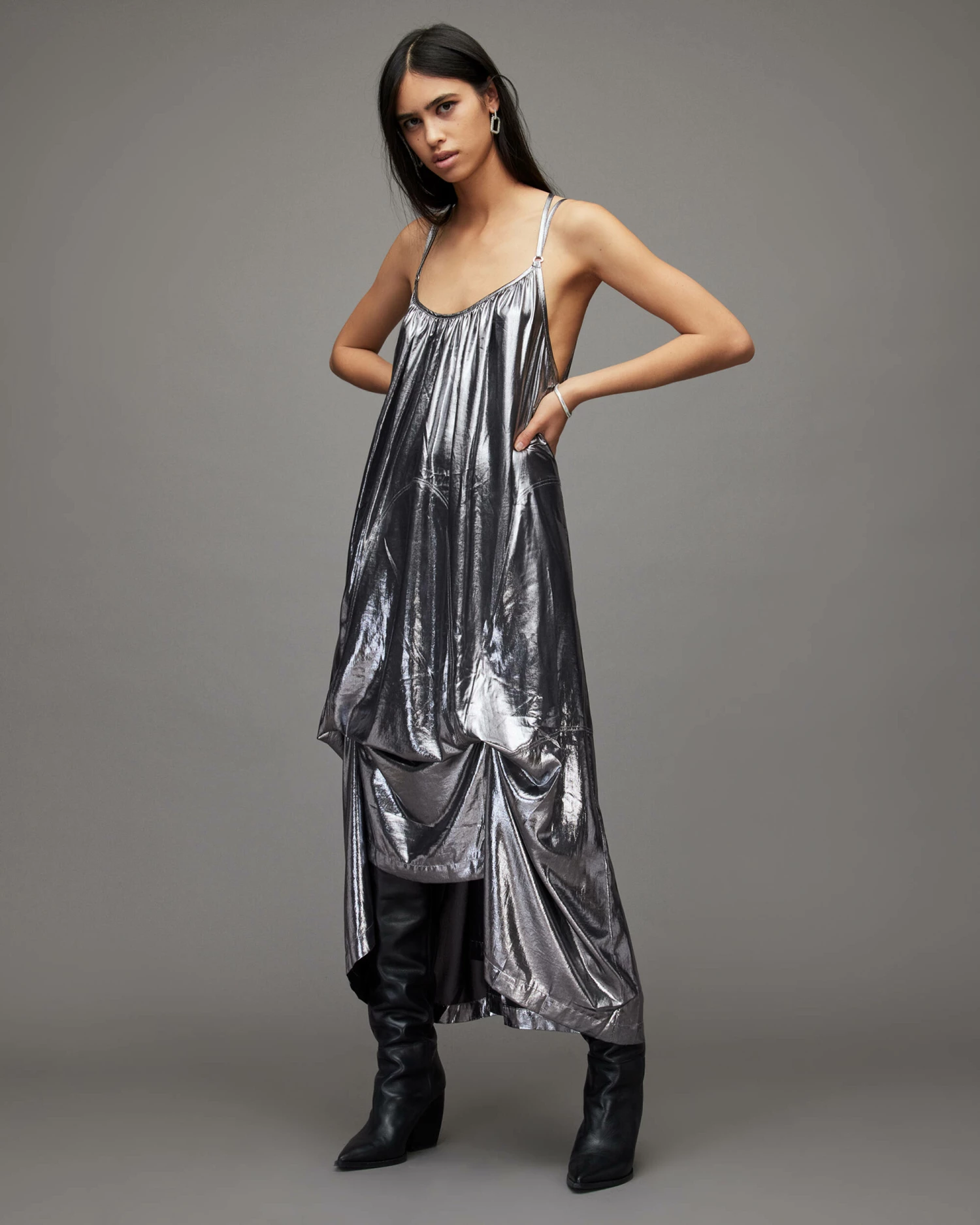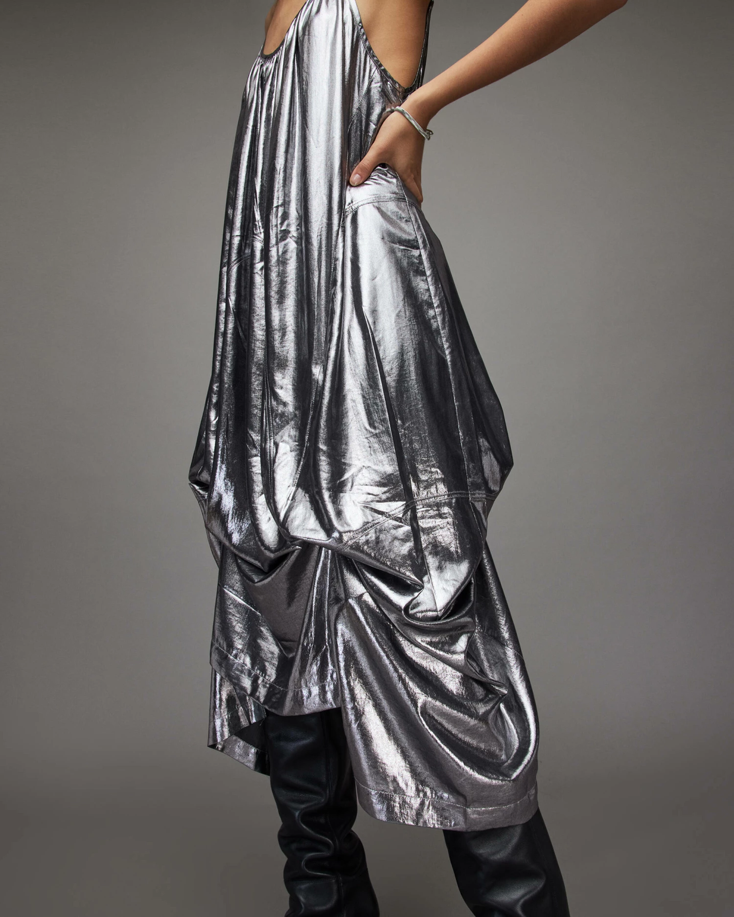 Turn up the volume, the Areena Dress has plenty. The metallic material has been shaped to a flowy silhouette. Defined by curved seaming and adjustable draping detail. The D-ring pulls it all together – make it your own.