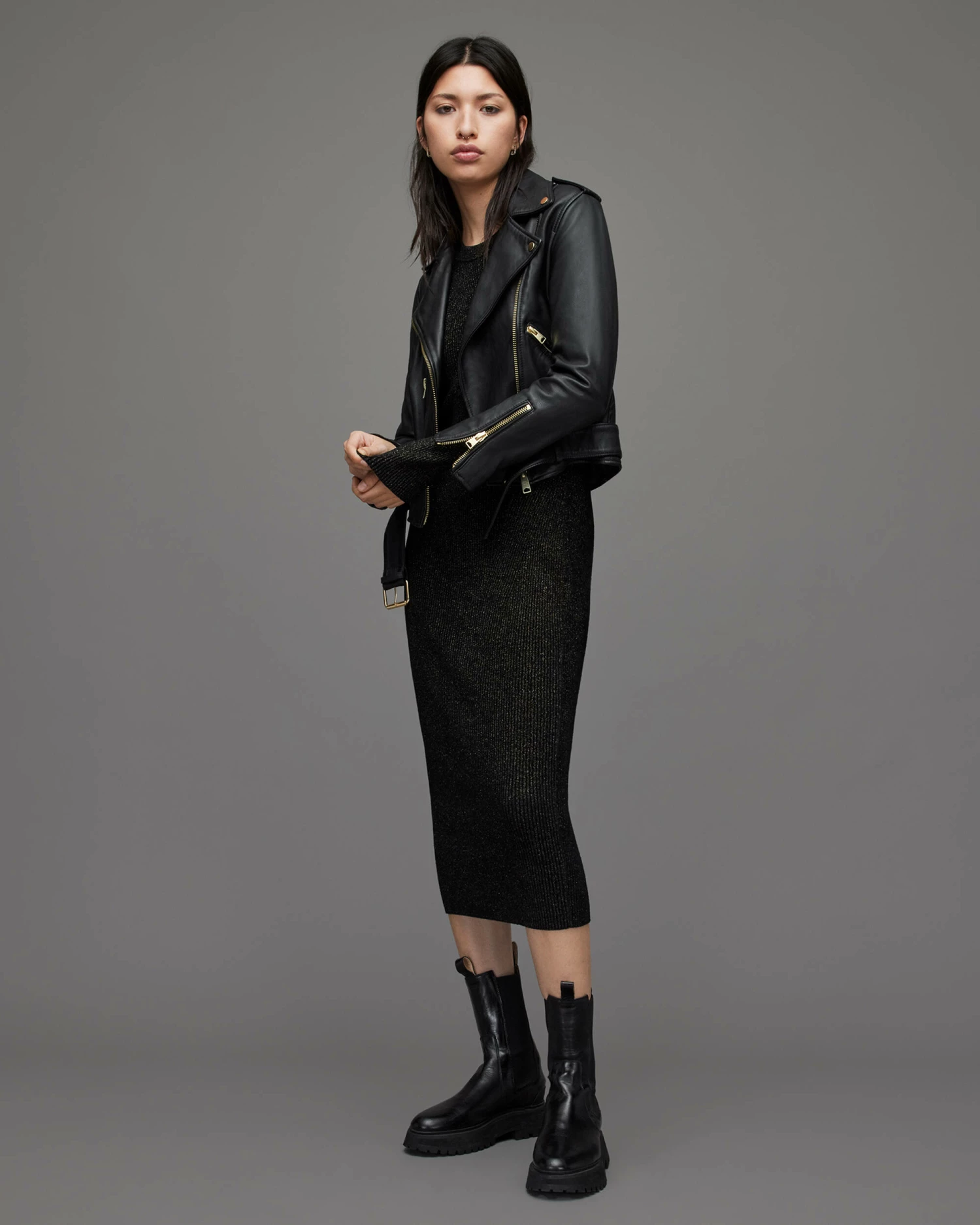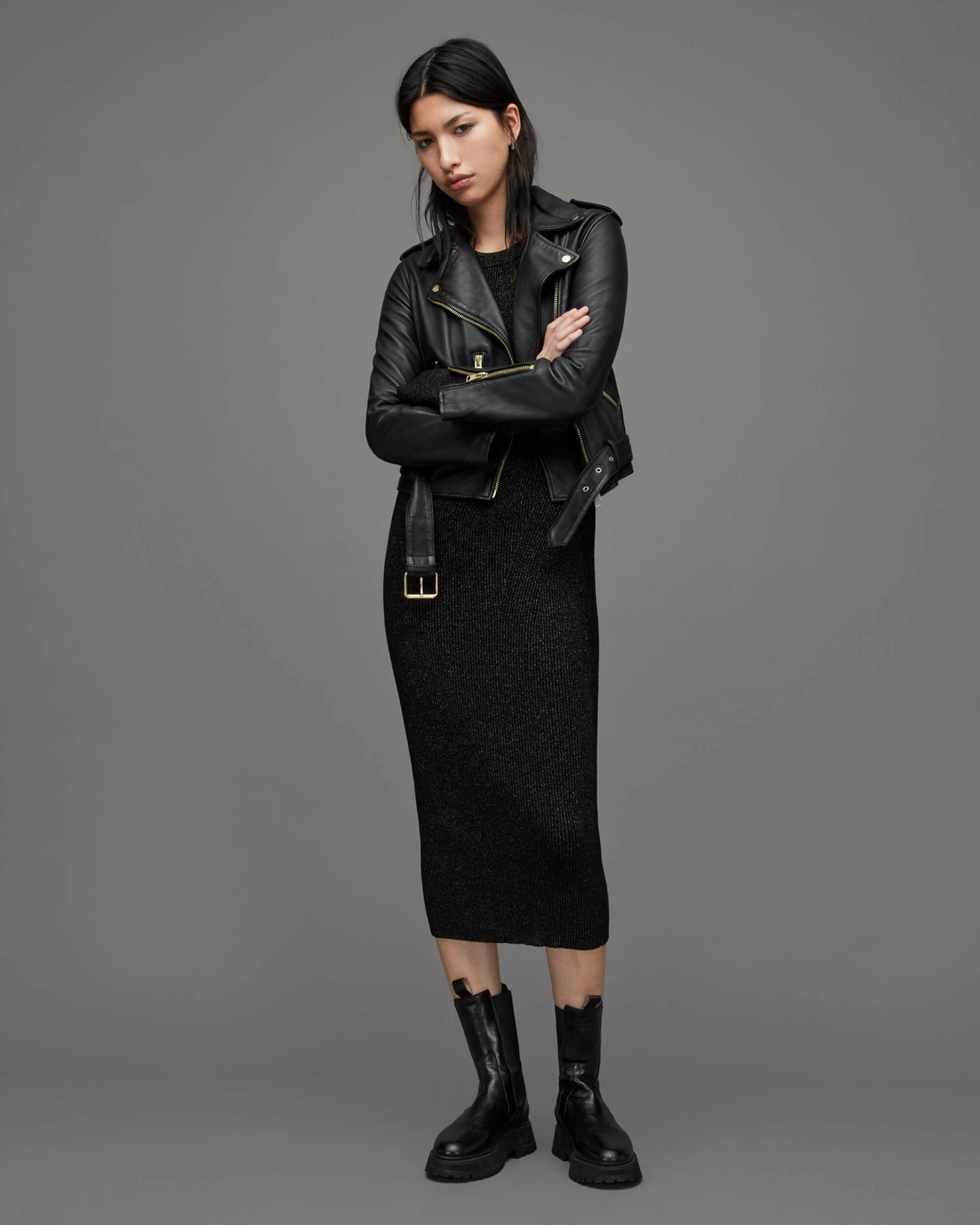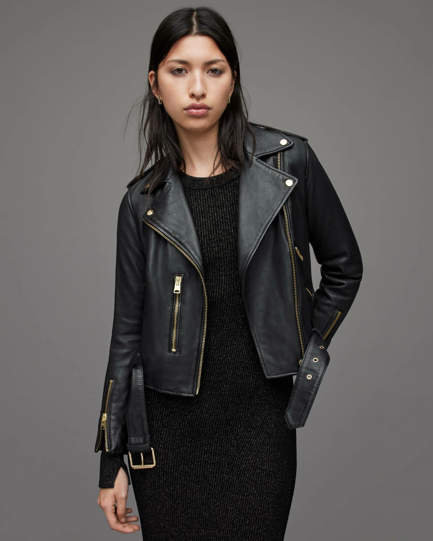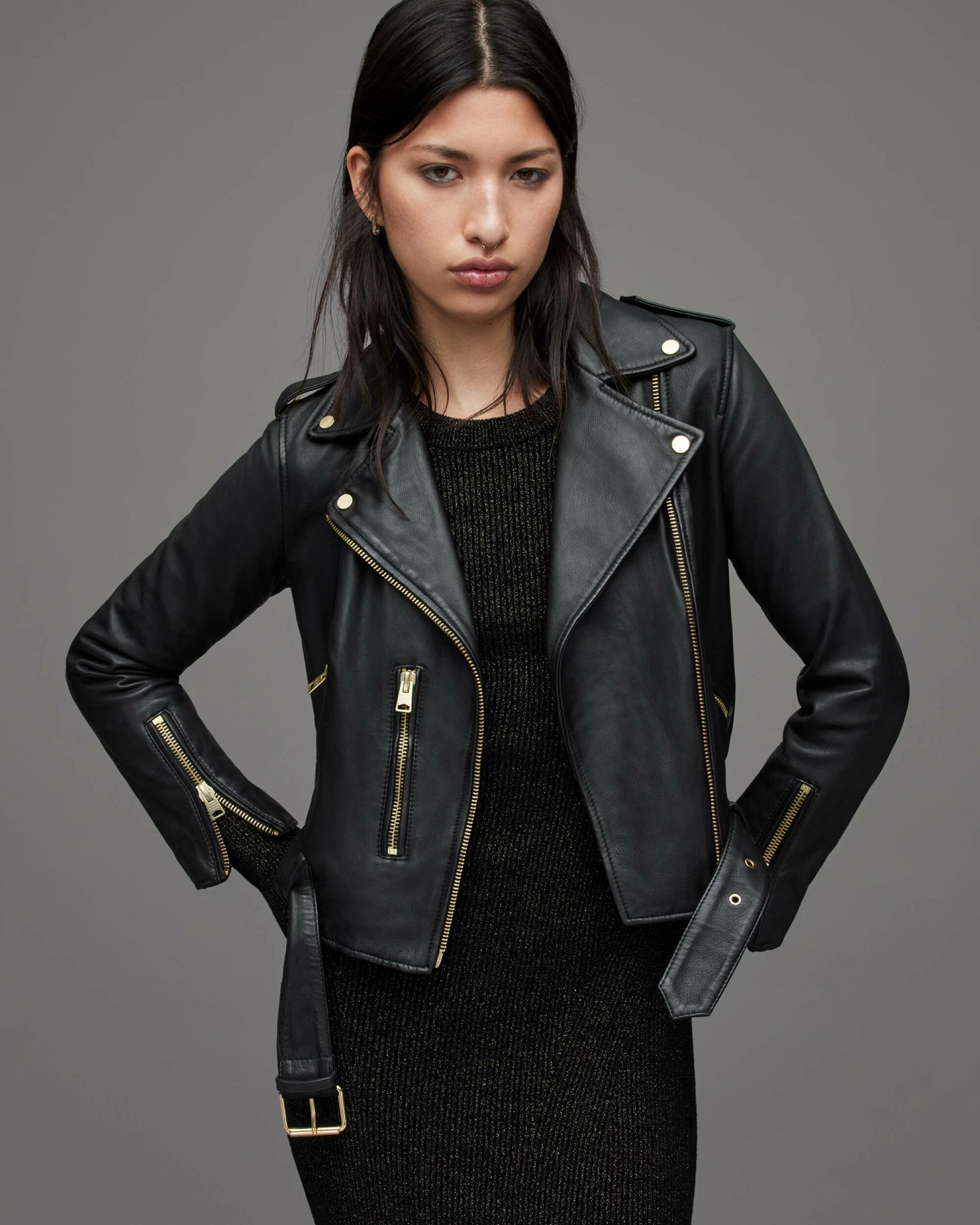 The Balfern Biker Jacket. A best-seller, you can wear again and again. Crafted from leather with updated gold-tone metal hardware. Zip pockets and a classic waist belt too – motorbike optional.