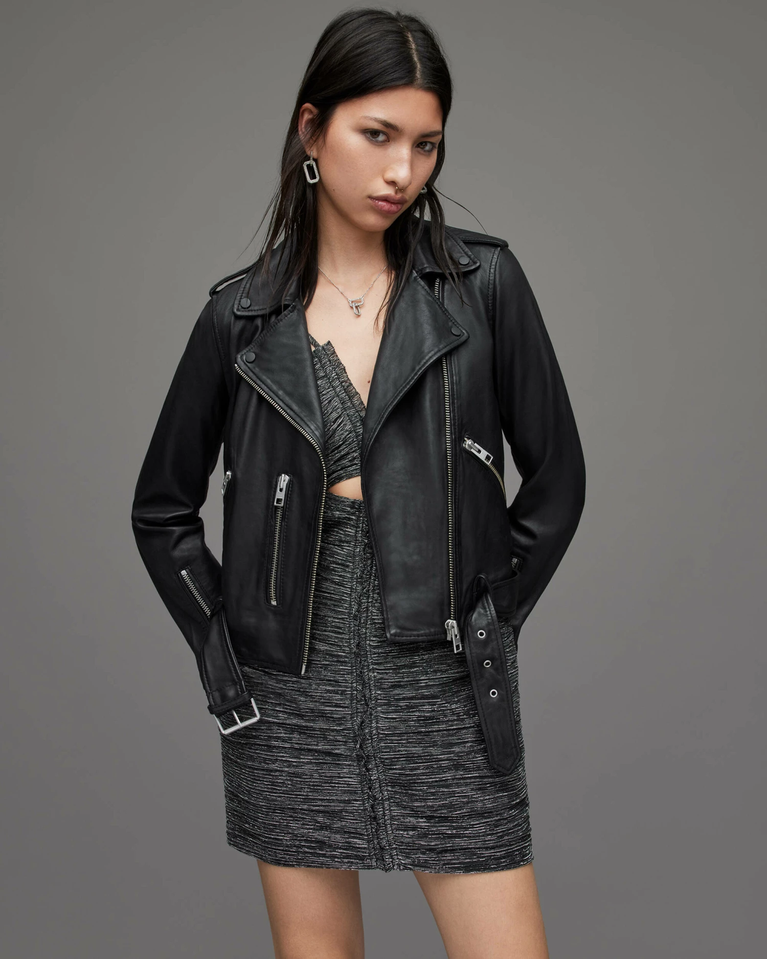 Meet our iconic best-seller, the Balfern Biker Jacket. It’s shaped to a regular silhouette. And crafted from leather that softens after each wear. It’s finished with metal hardware and a waist belt – motorbike calling.
