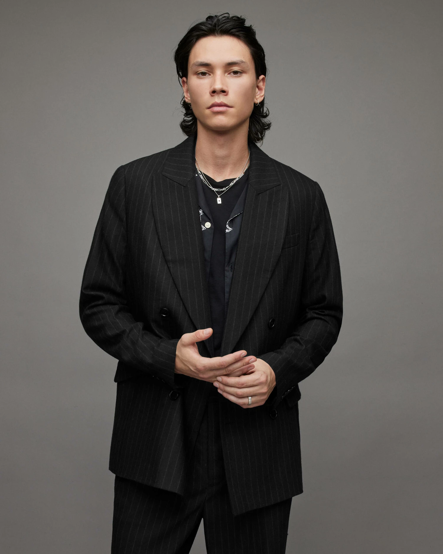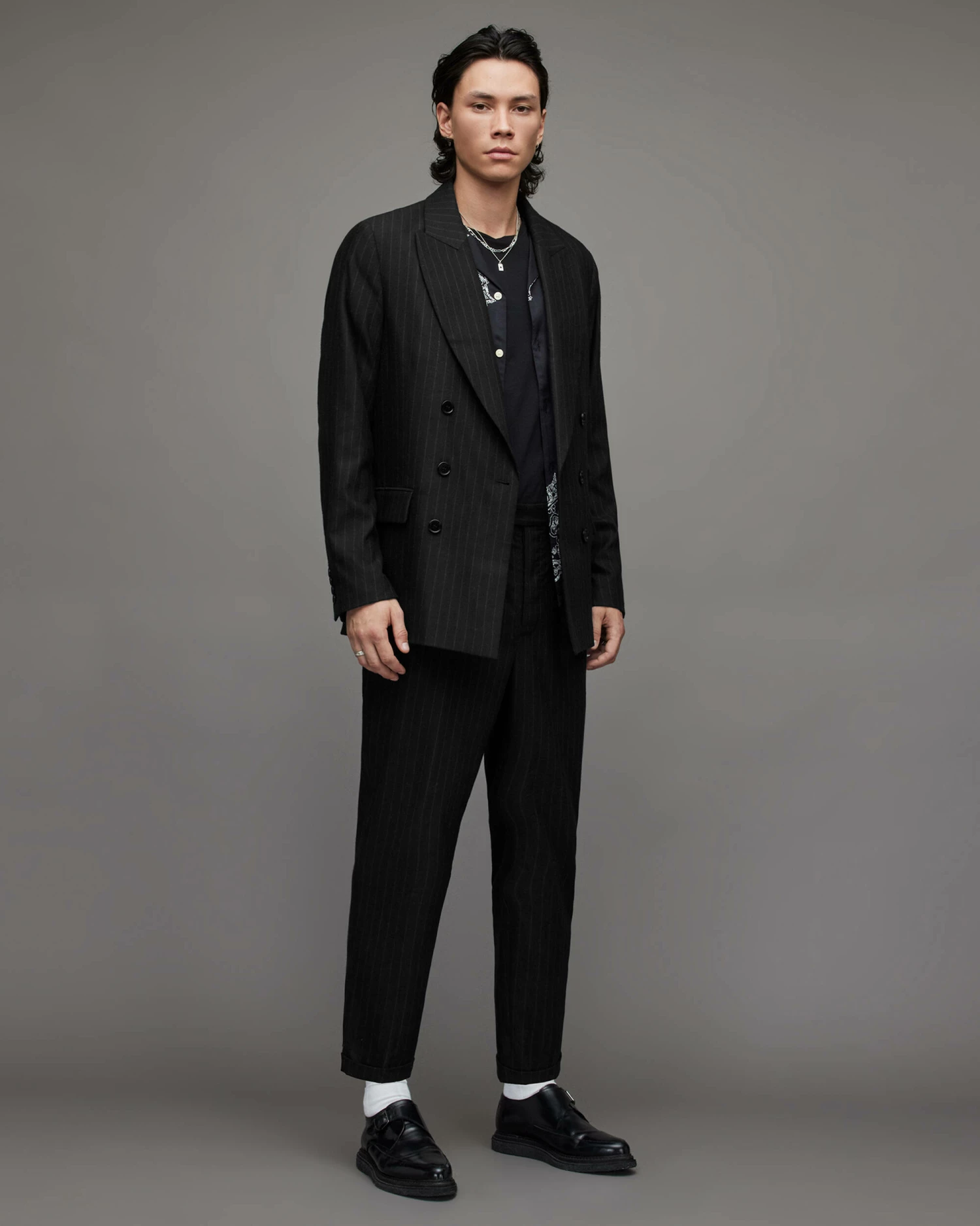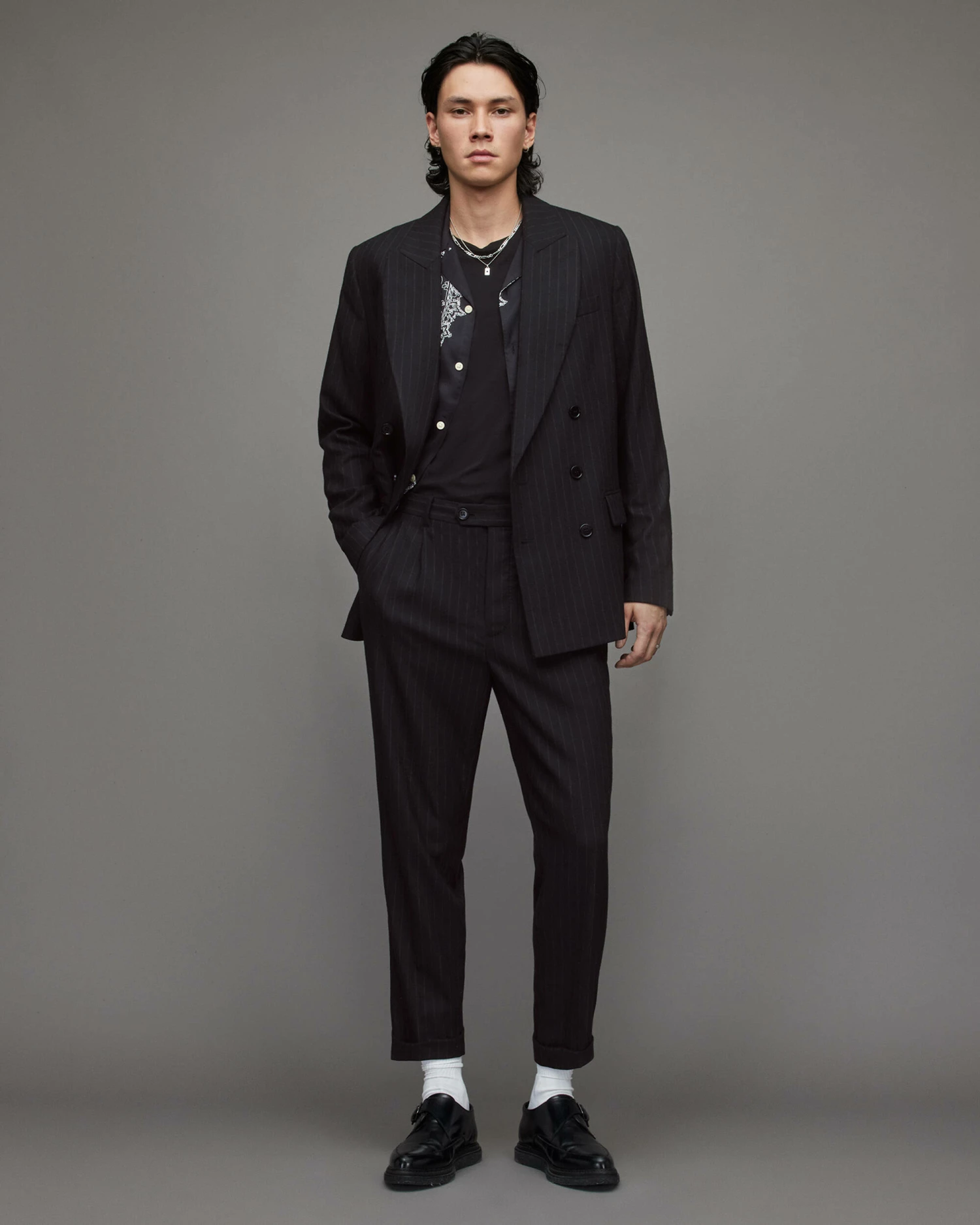 We’re into the Blues Blazer. Pinstriped, but it’s not obvious. This tailored staple has a modern feel. Shaped to a relaxed fit with a peak lapel.