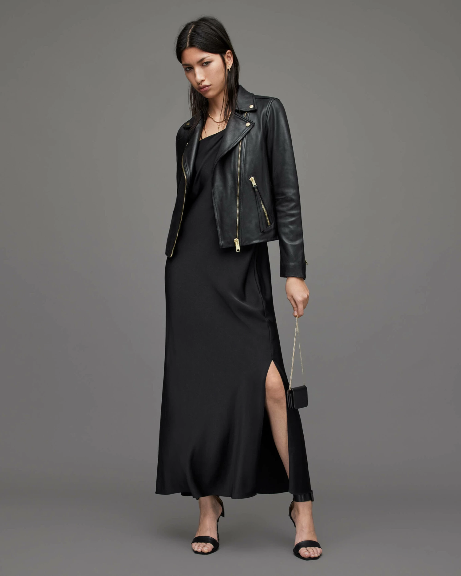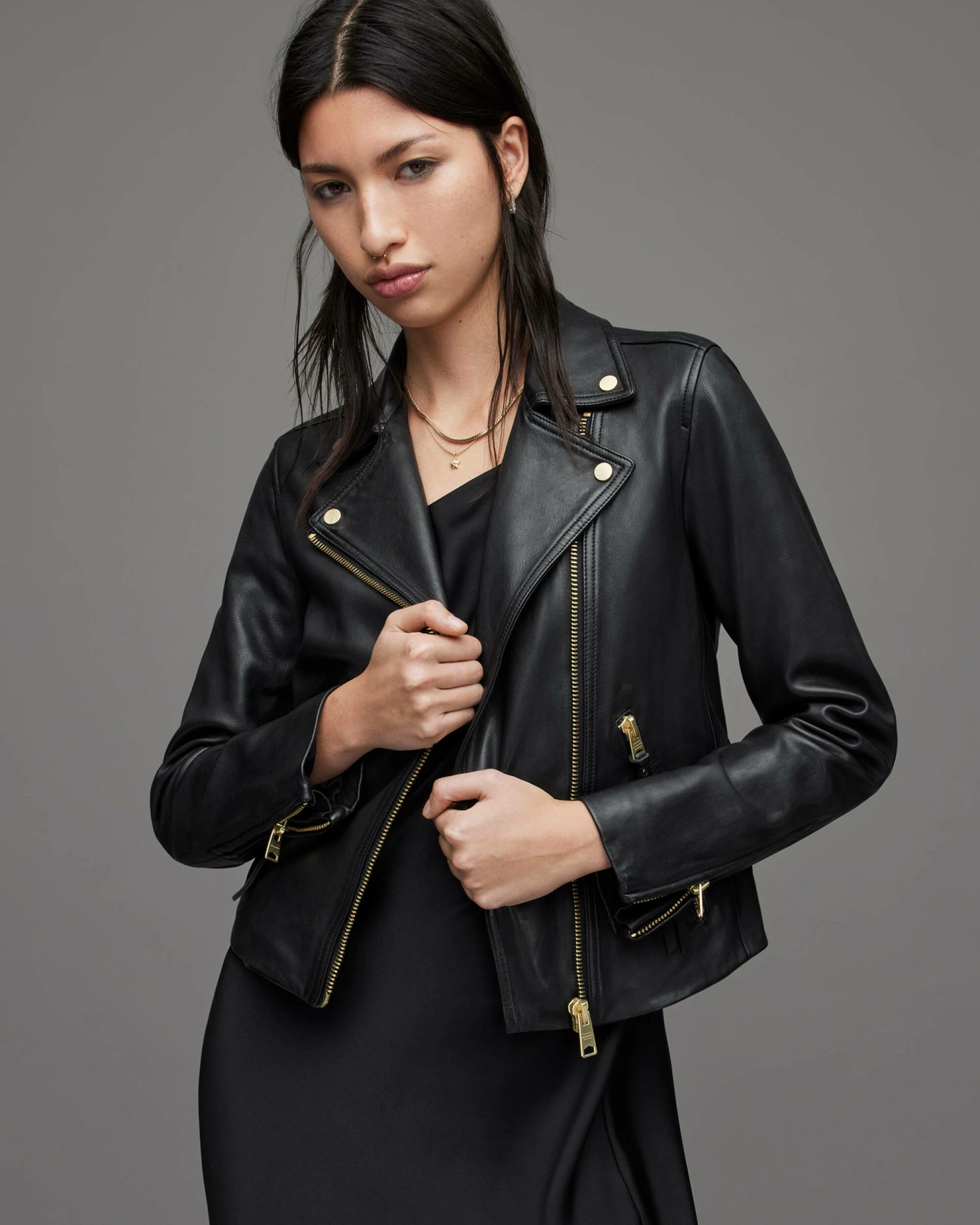 Keep it simple. The Dalby Biker Jacket features two lower zip pockets and gold-tone metal hardware on a classic soft leather backdrop โ it’s timeless.