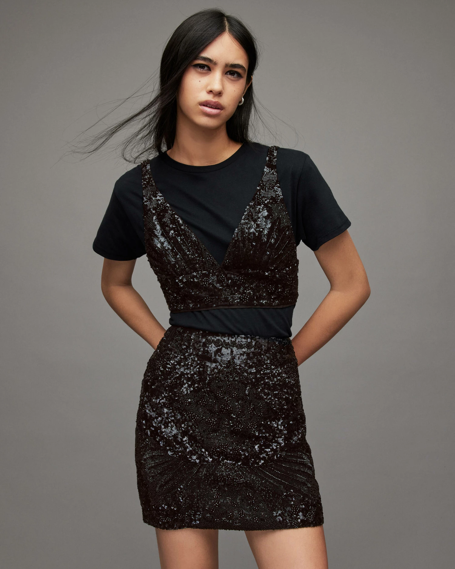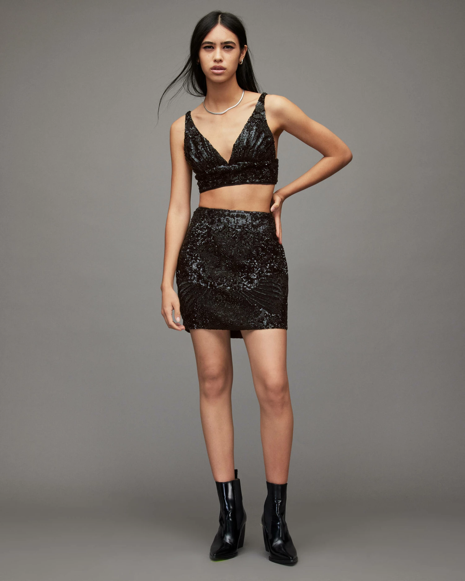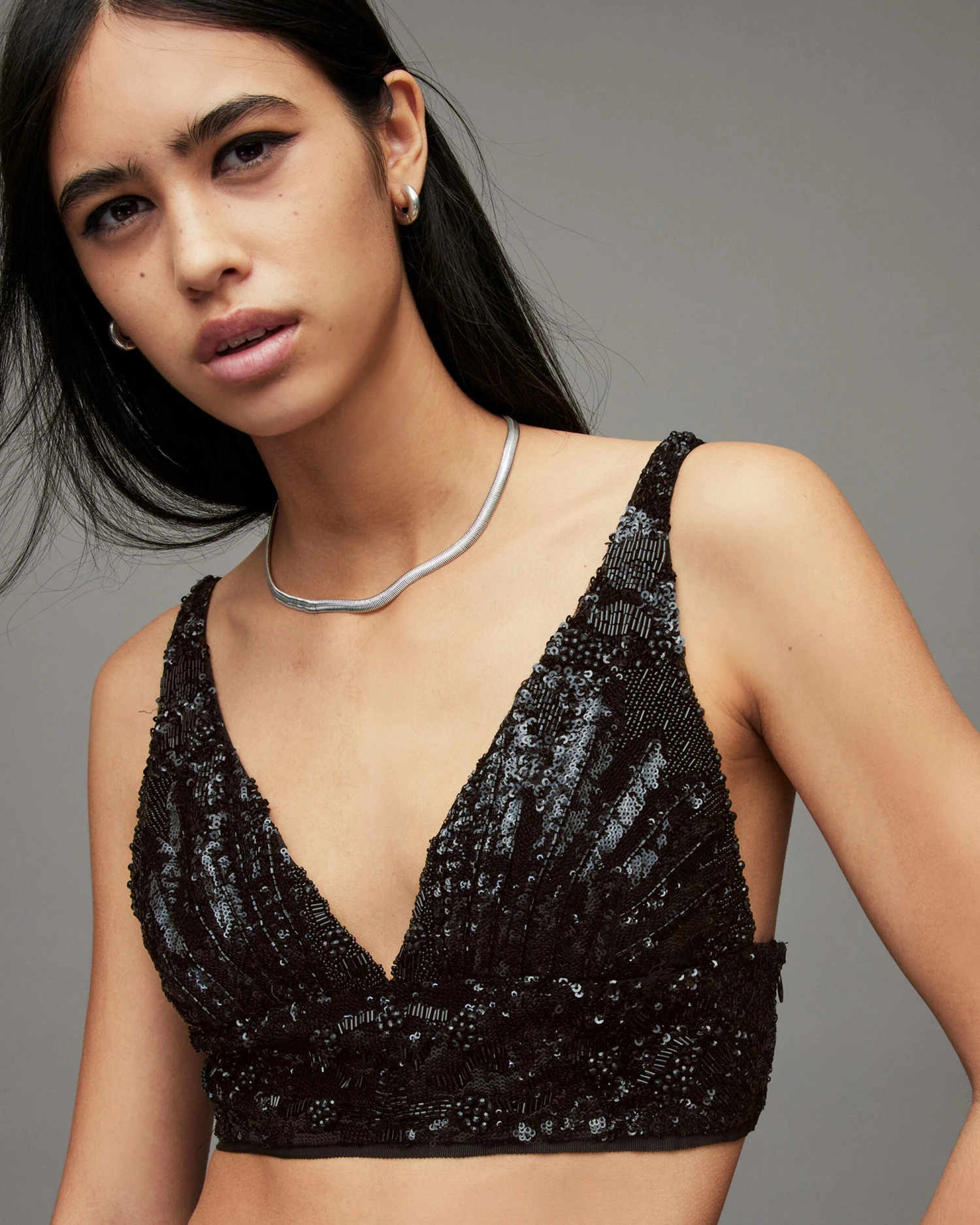 Time to sparkle. This is how AllSaints does embellishment. This v-neck bralette is part of matching set. Party season is calling.