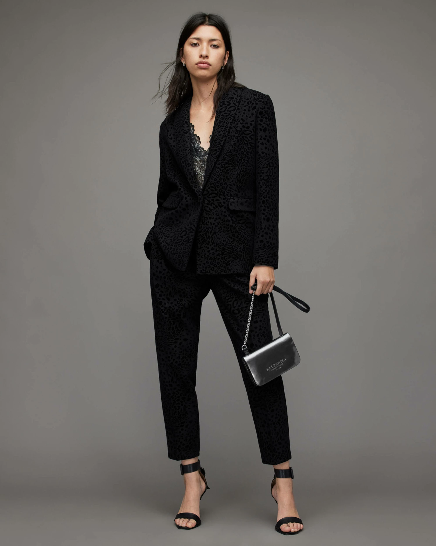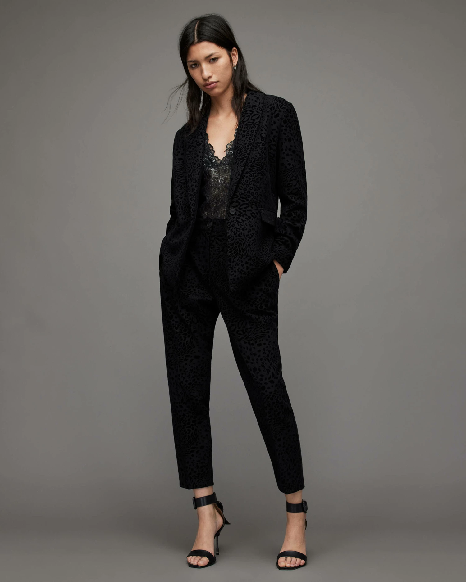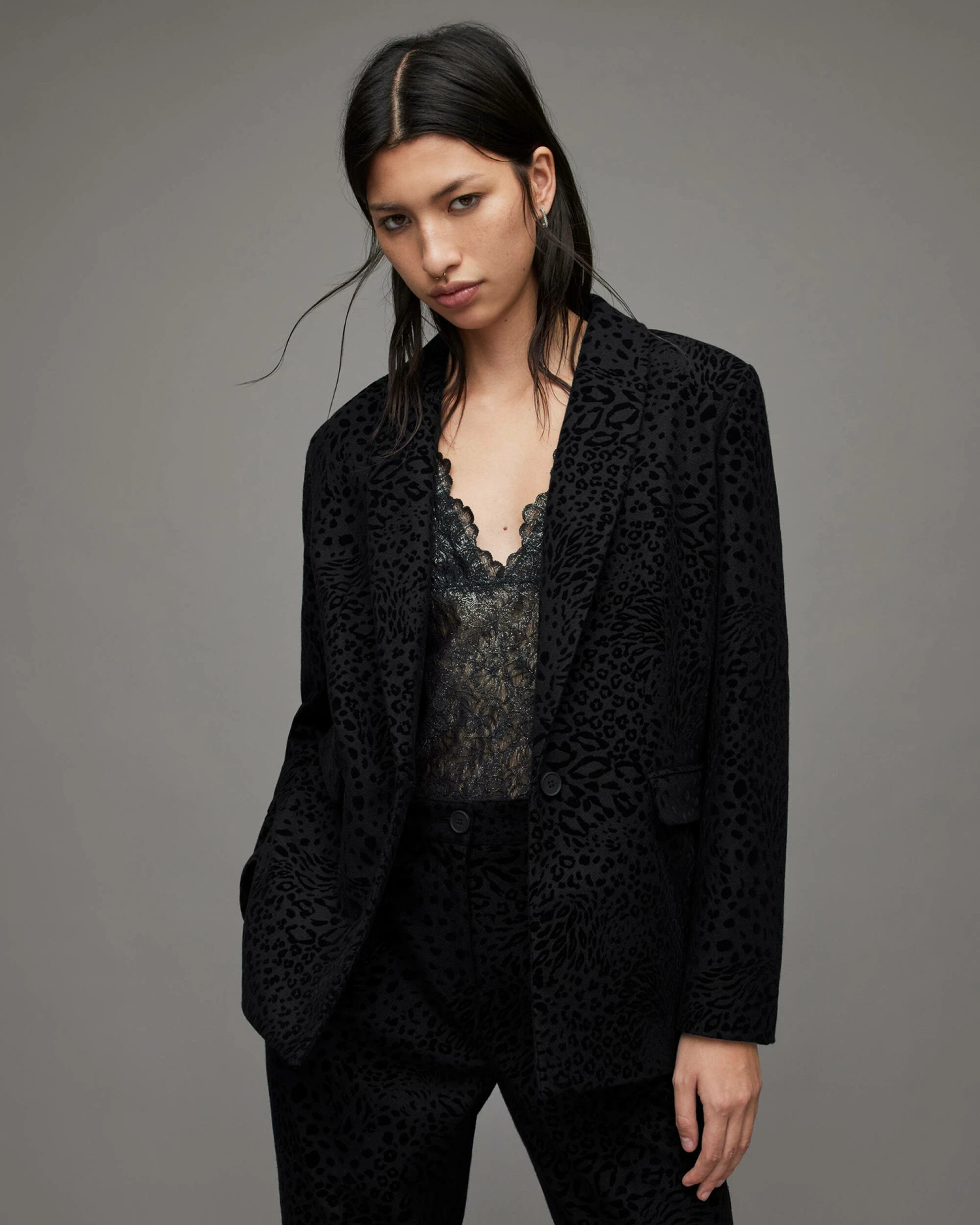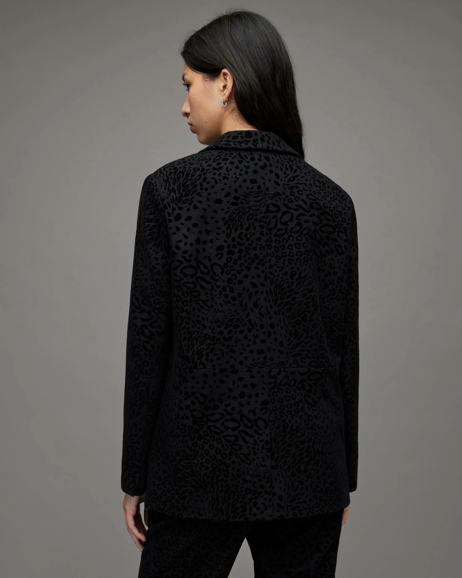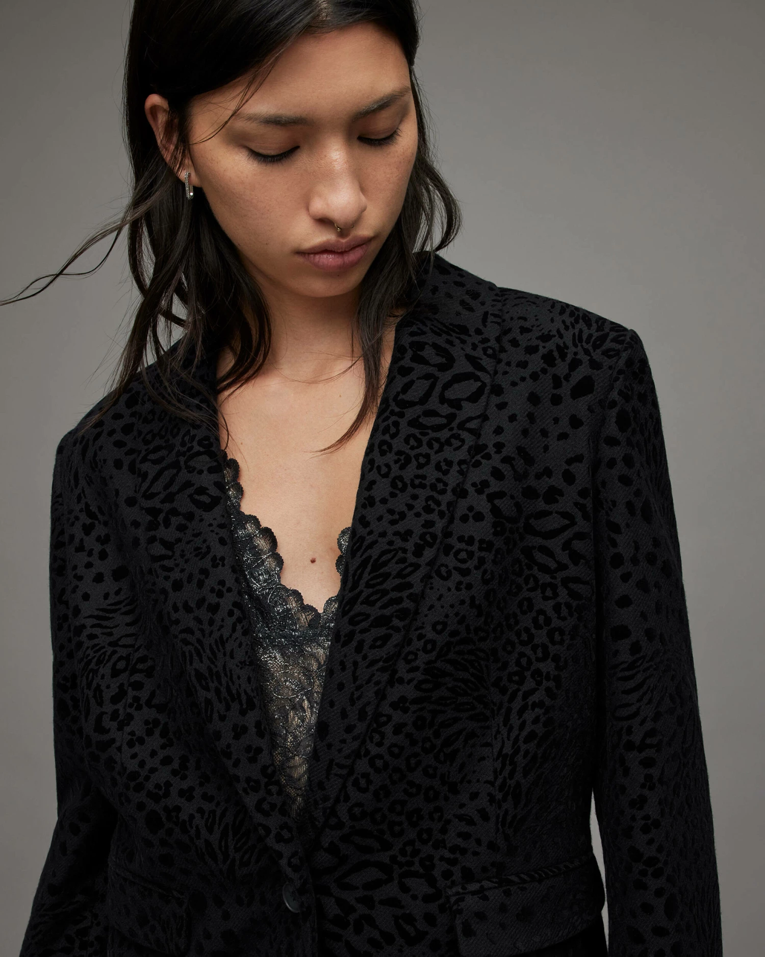 The Laila Blazer is shaped to a modern structure and is crafted from a wool blend fabric. Double breasted with a shawl collar, it takes a relaxed approach. Flocked leopard print is a subtle additon.