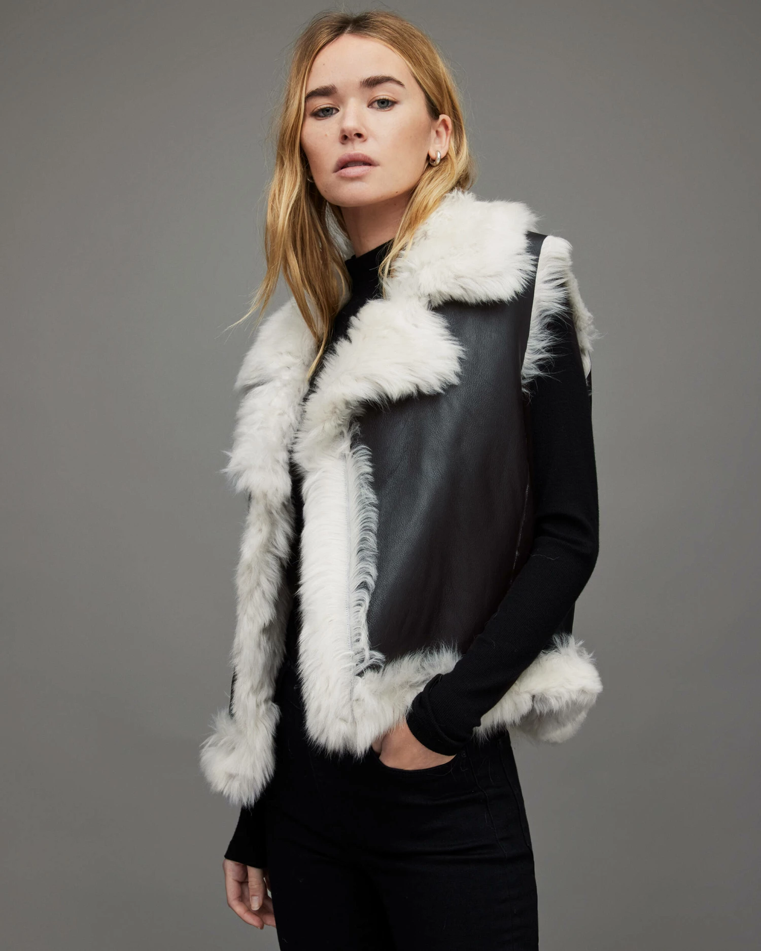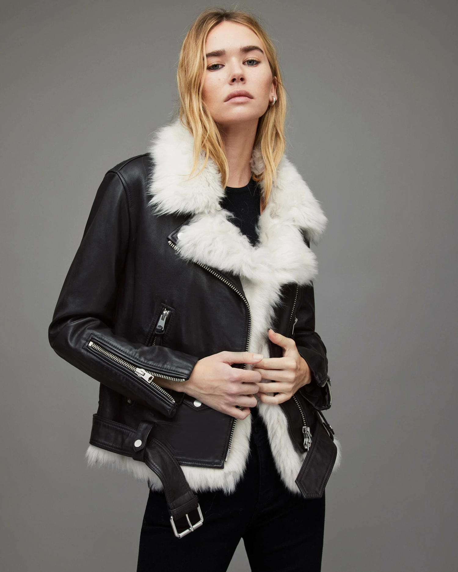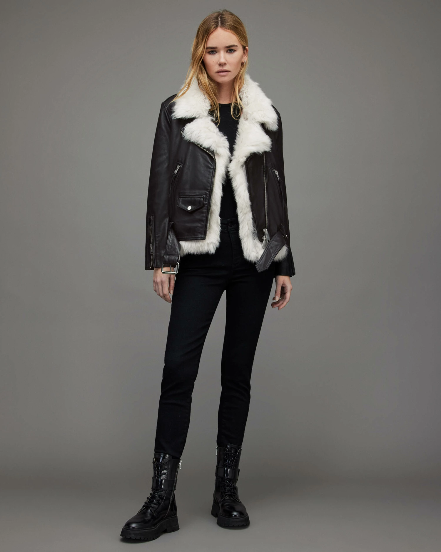 Get stopped in the street with The Luna Biker, it’s 4-in-1. With a removable and reversible gilet, crafted from straight-haired shearling. Shaped to an oversized fit with a statement collar and smooth leather body.