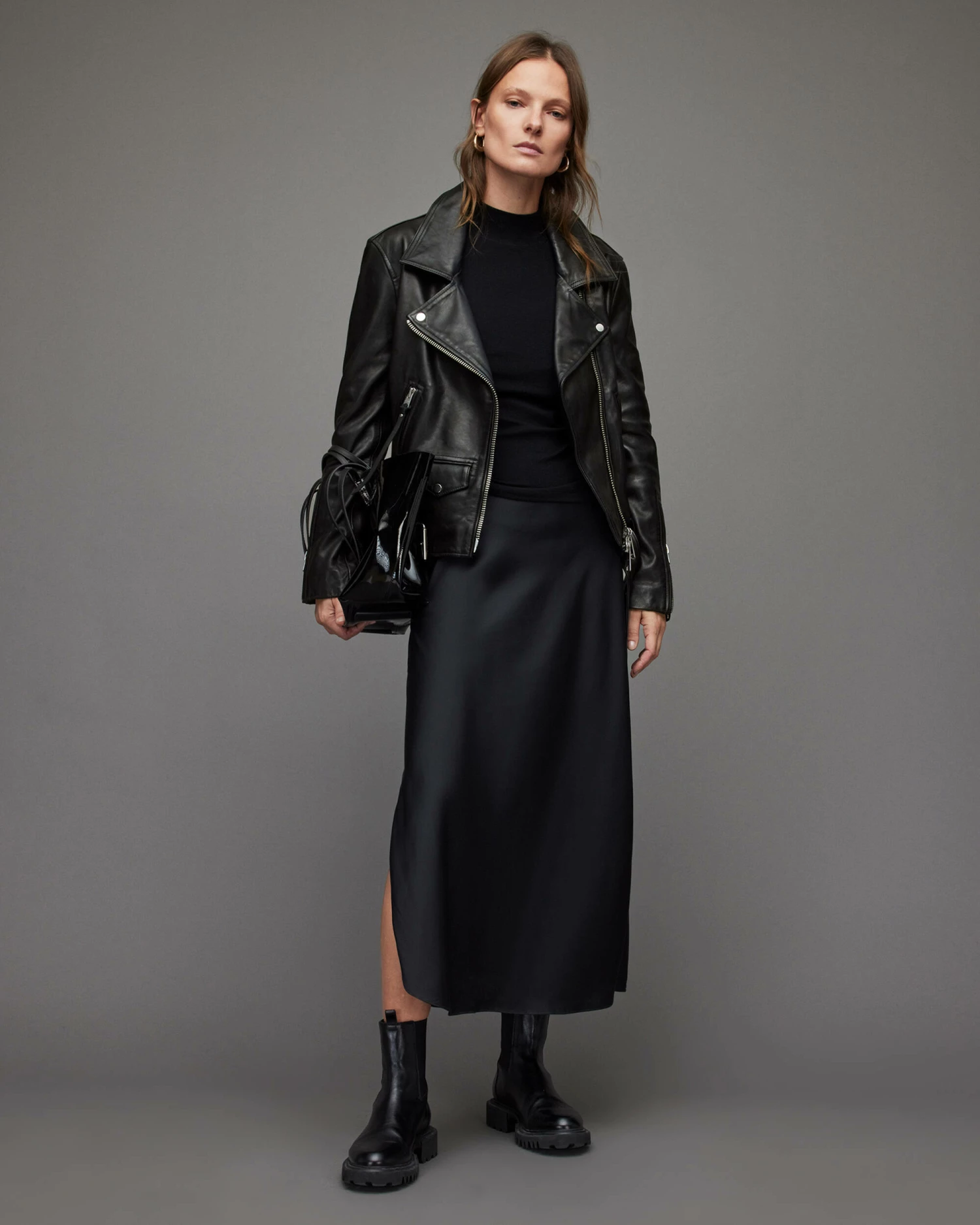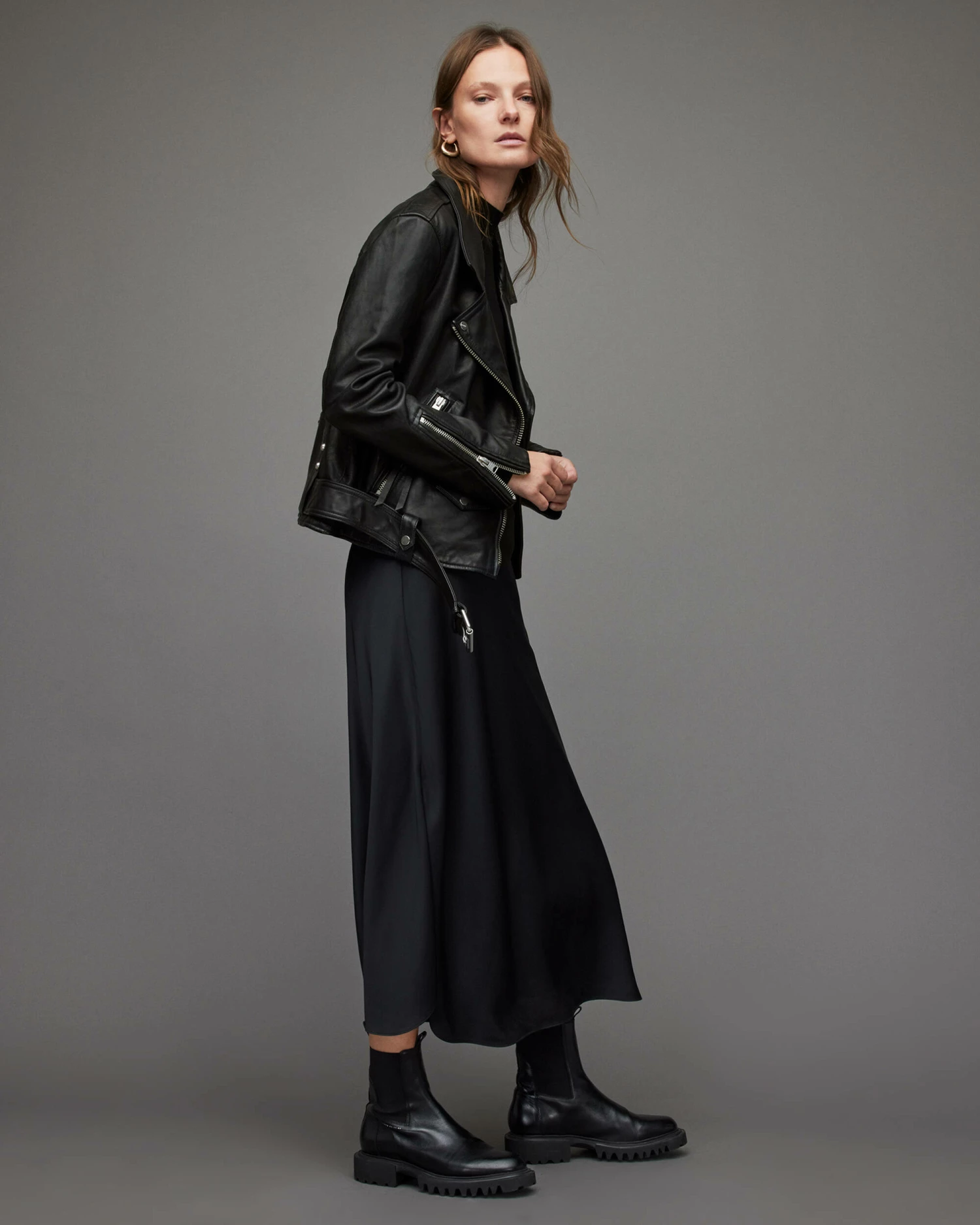 Oversized leather. We love it. The Luna. A move on from your favourite Billie Biker Jacket. Crafted from smooth leather. Heavily washed and tumbled. For a high-low effect. With metal hardware to complement.