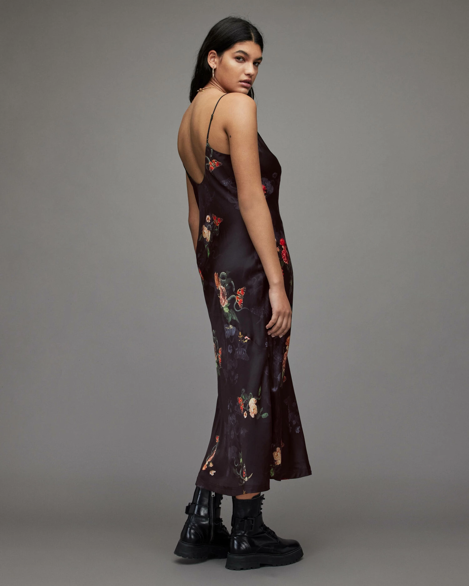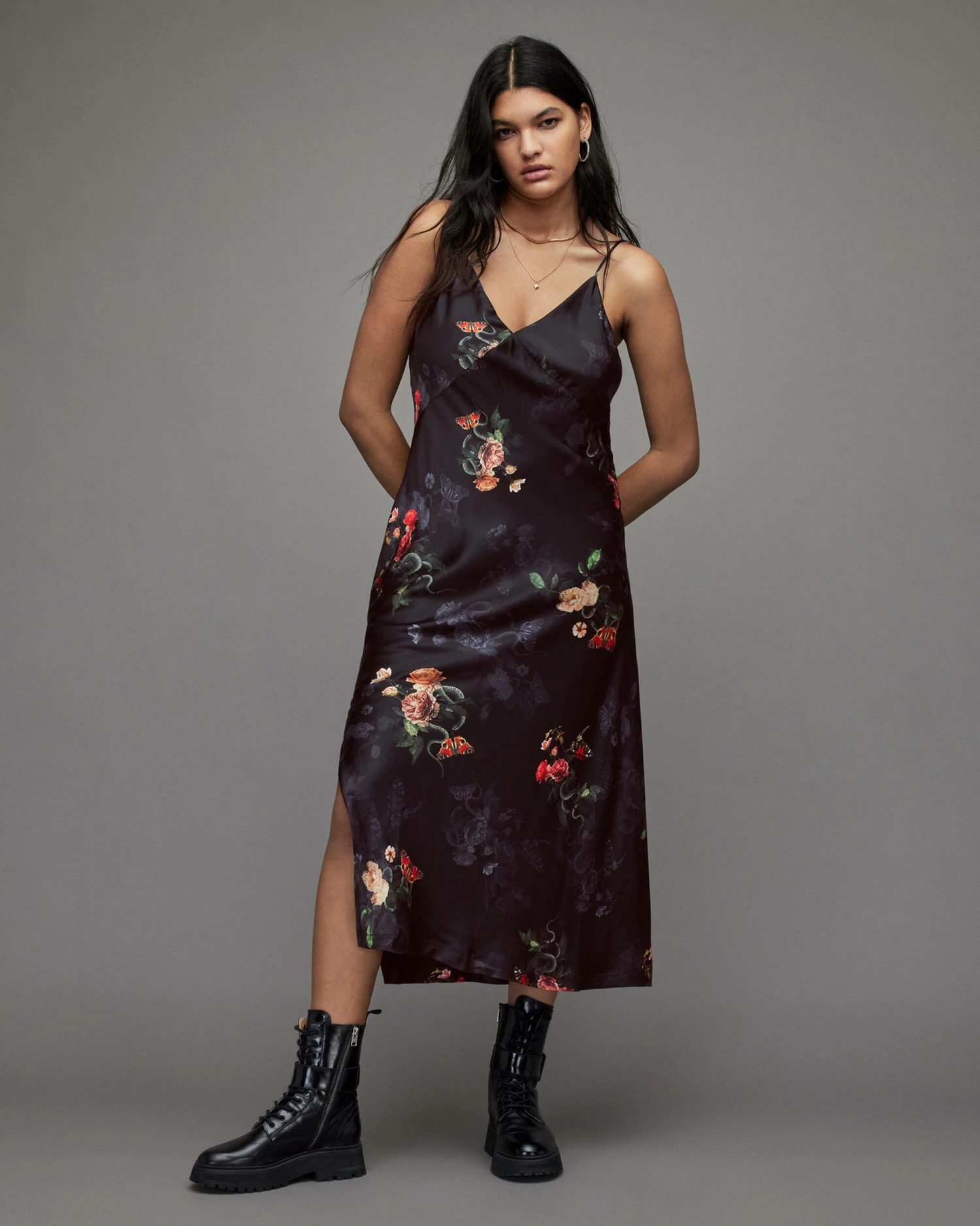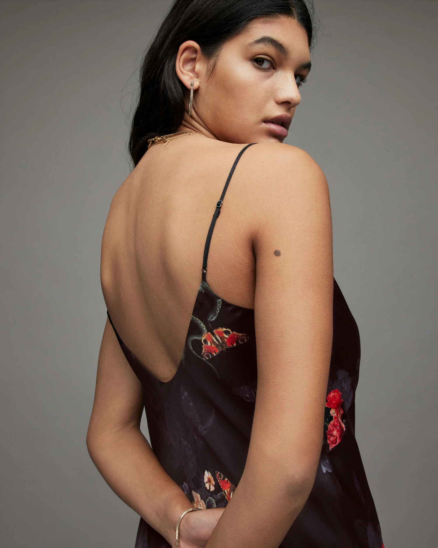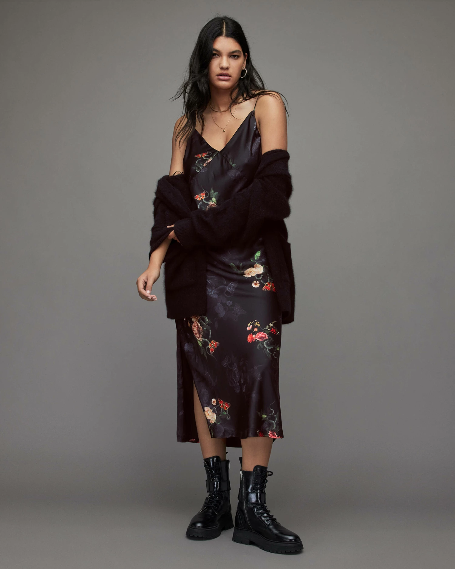 The slip you’ve been waiting for, it’s called the Melody Dress. Crafted from a lightweight fabric, with our new dark print – it sets a new mood.