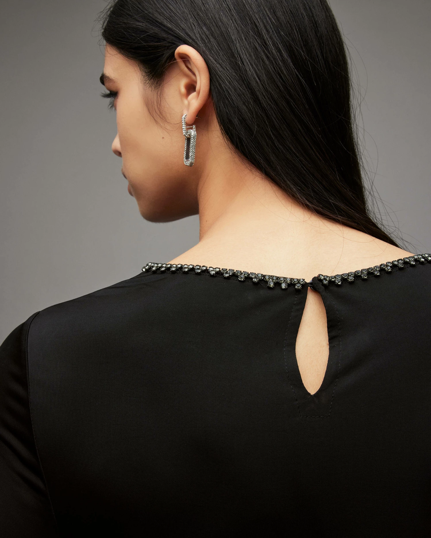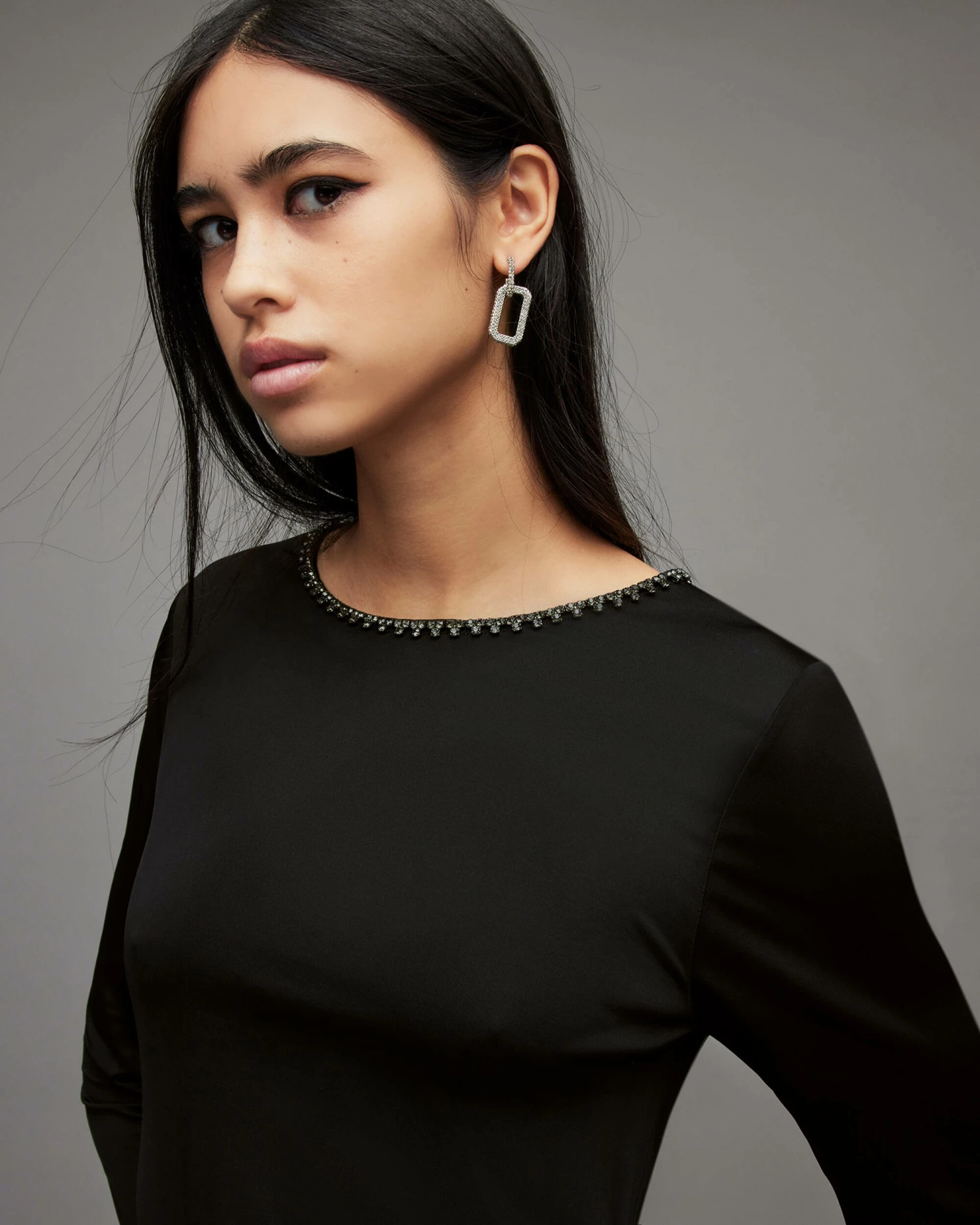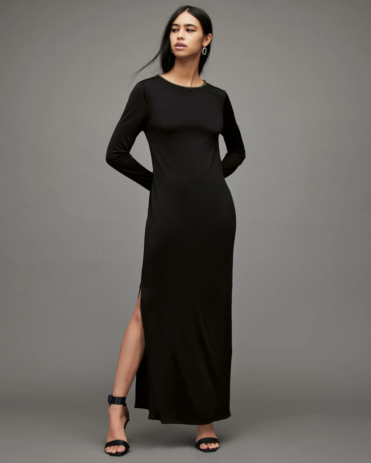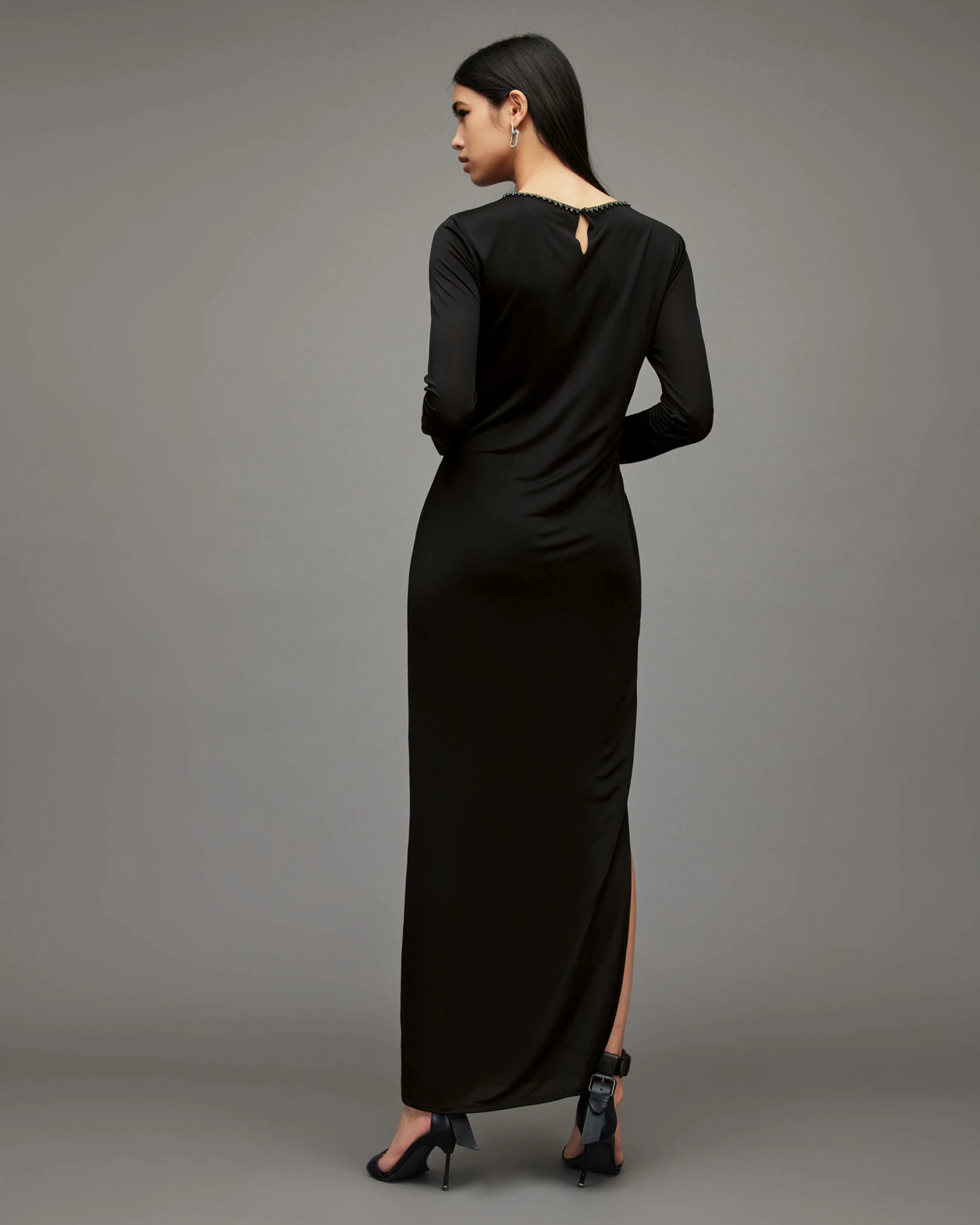 Made to flatter. This is the Nyx Maxi Dress. The long sleeve silhouette is slim fitting. Diamante detailing around the neckline adds a touch of elegance.