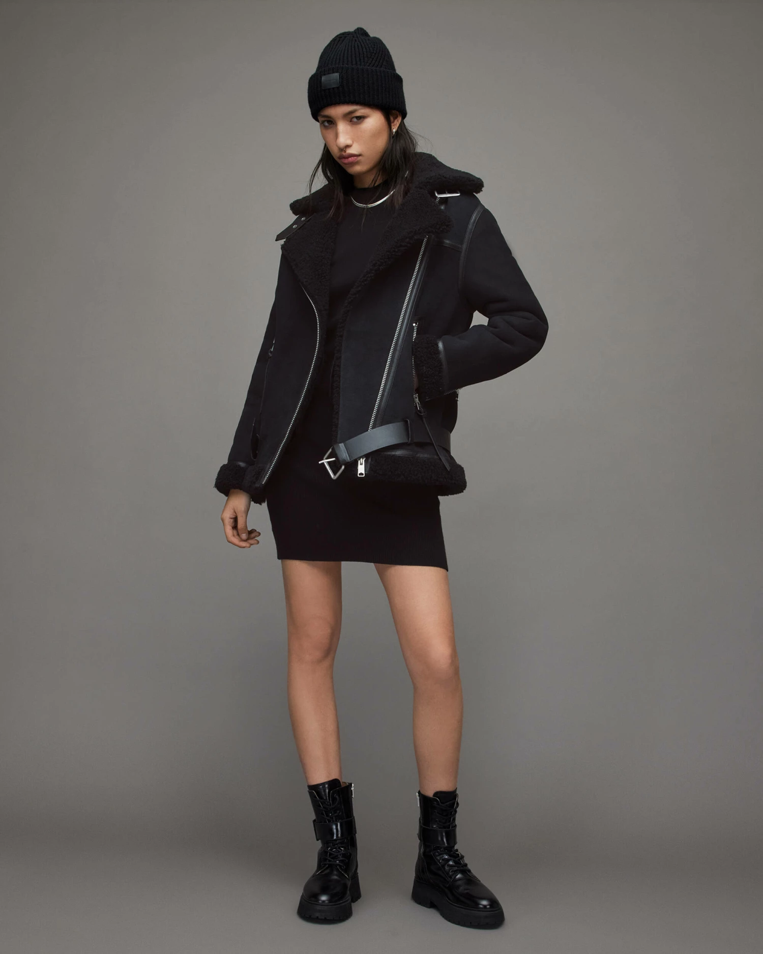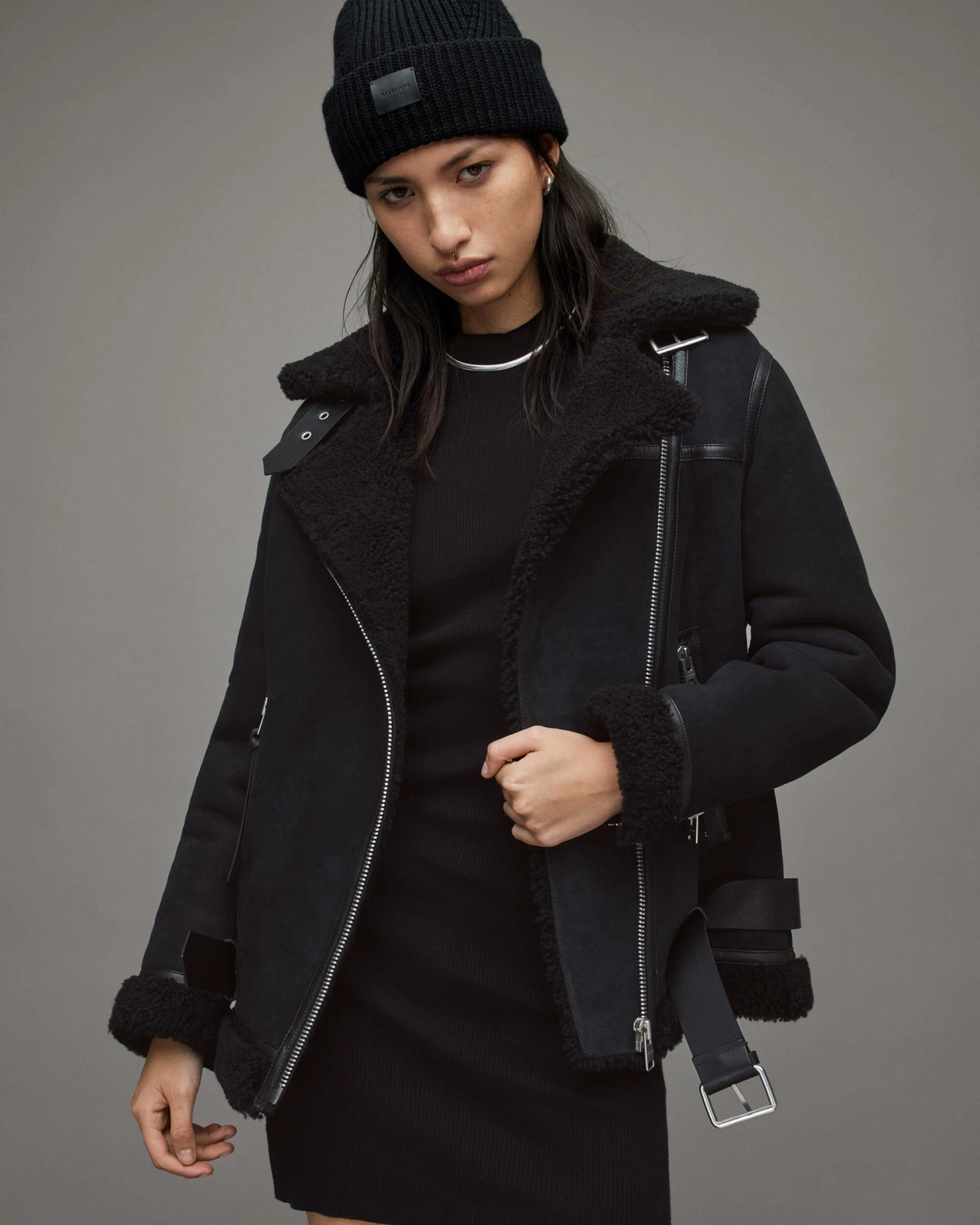 Shearlings for winter are always an option. The Rei is a lightweight version crafted from sheepskin with exposed shearling collar and trims. It’s oversized for an easy and comfortable fit.