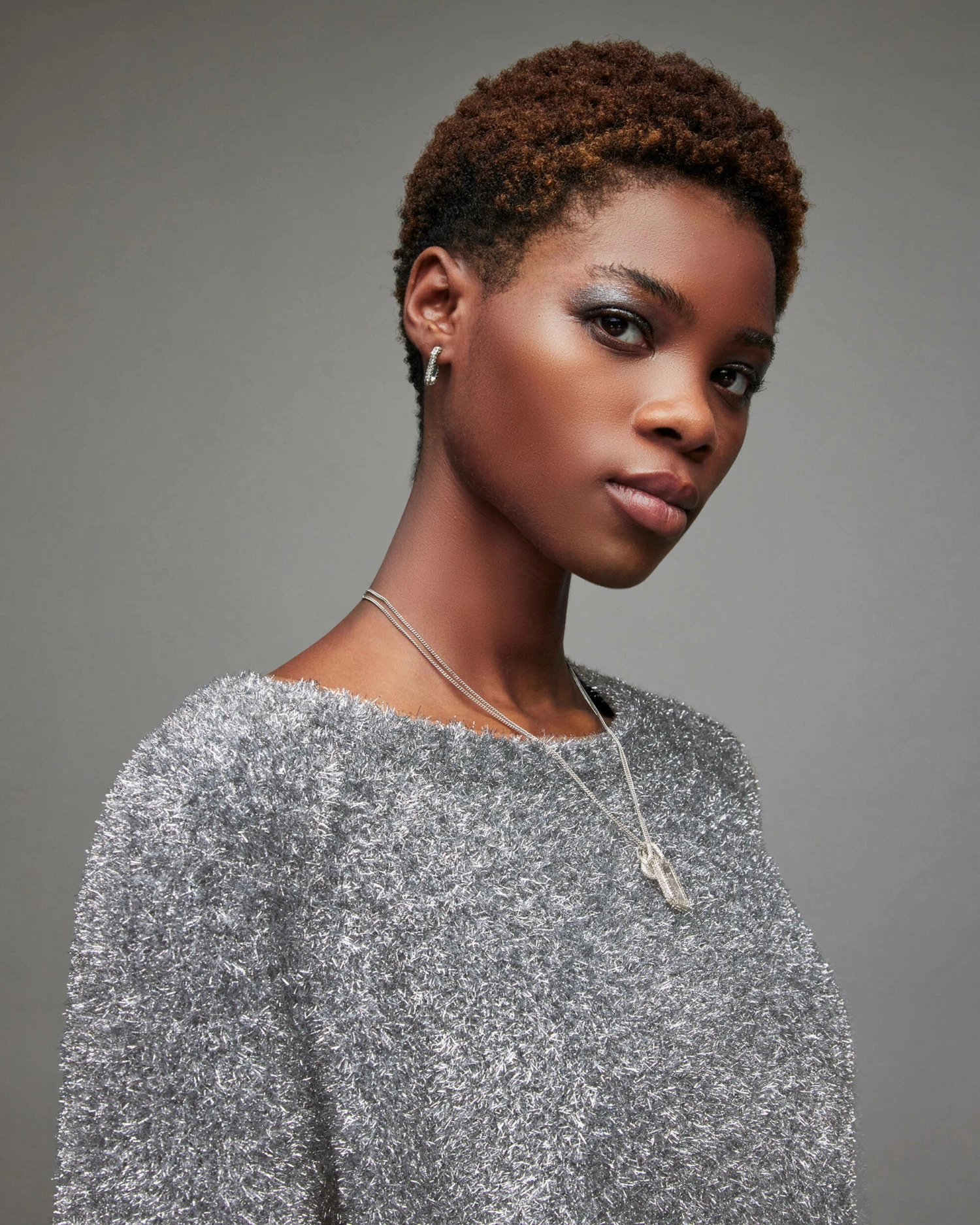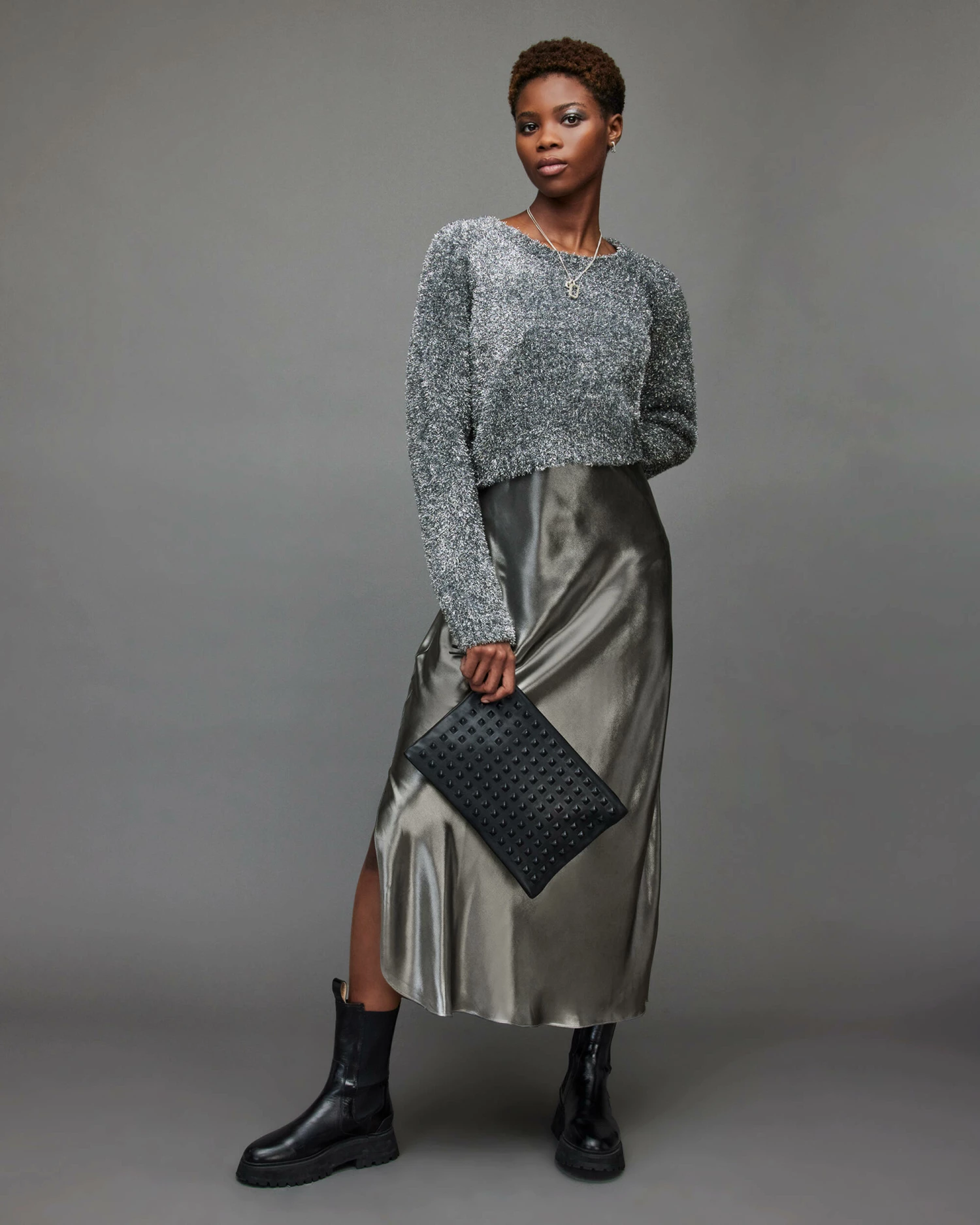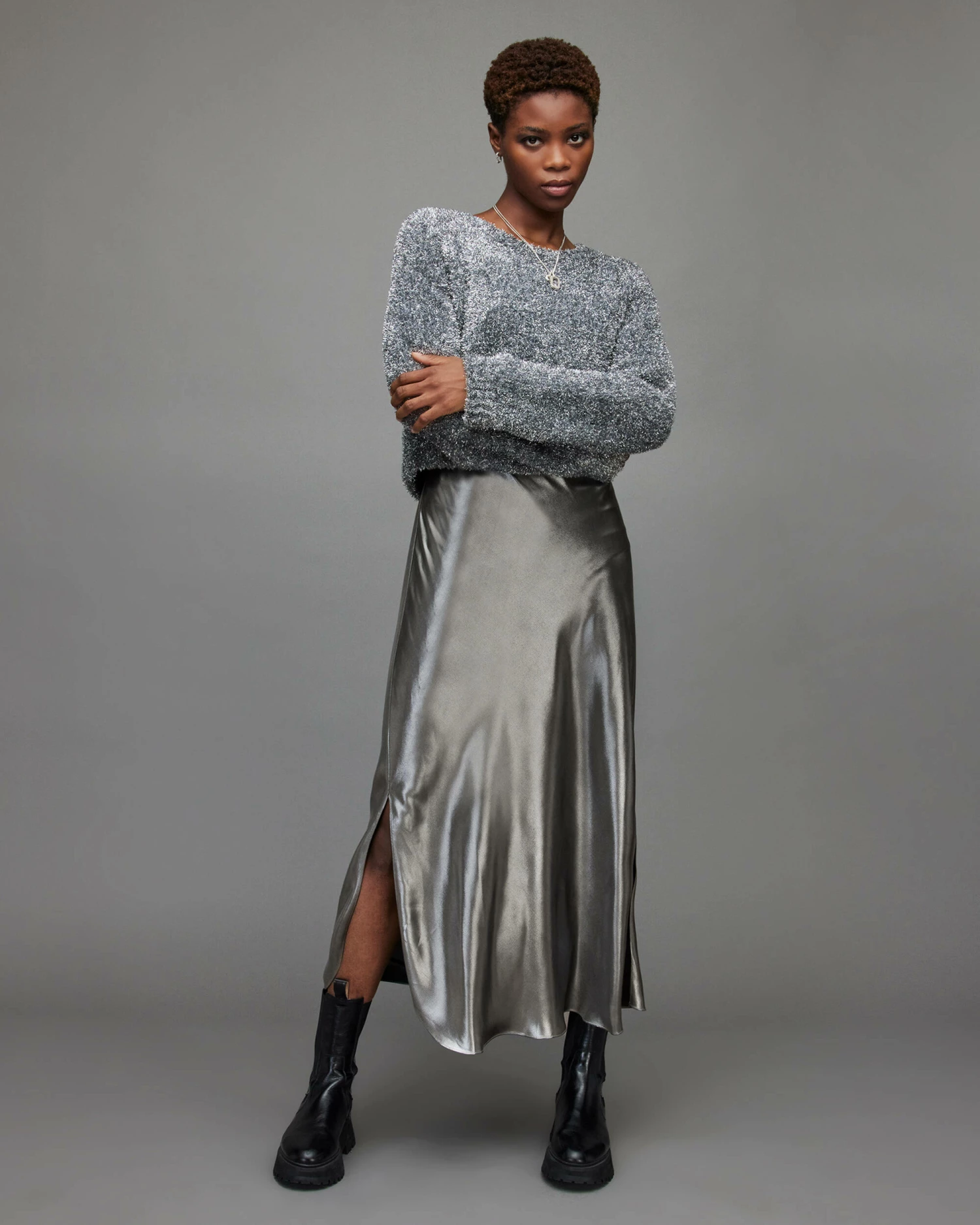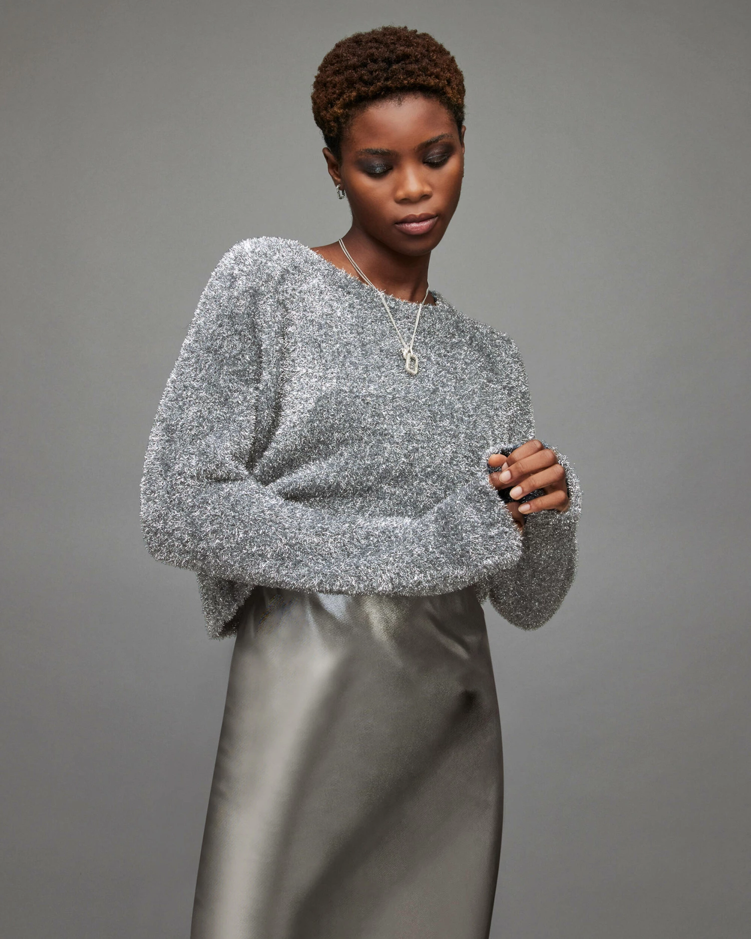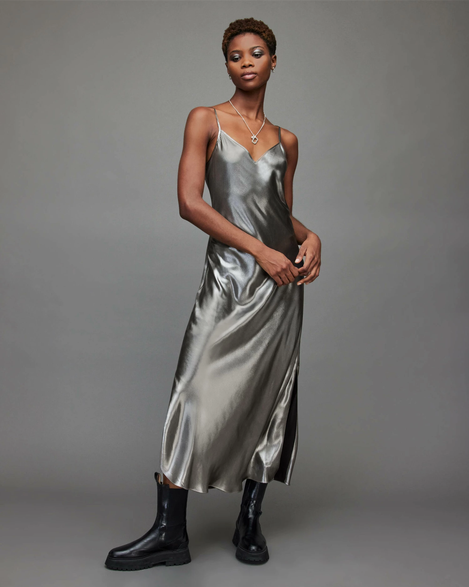Relaxed party wear, it’s a thing. This is the Rosetta Dress, it’s a fun 2-in-1 style. Featuring a tinsel jumper layered over a staple slip dress.