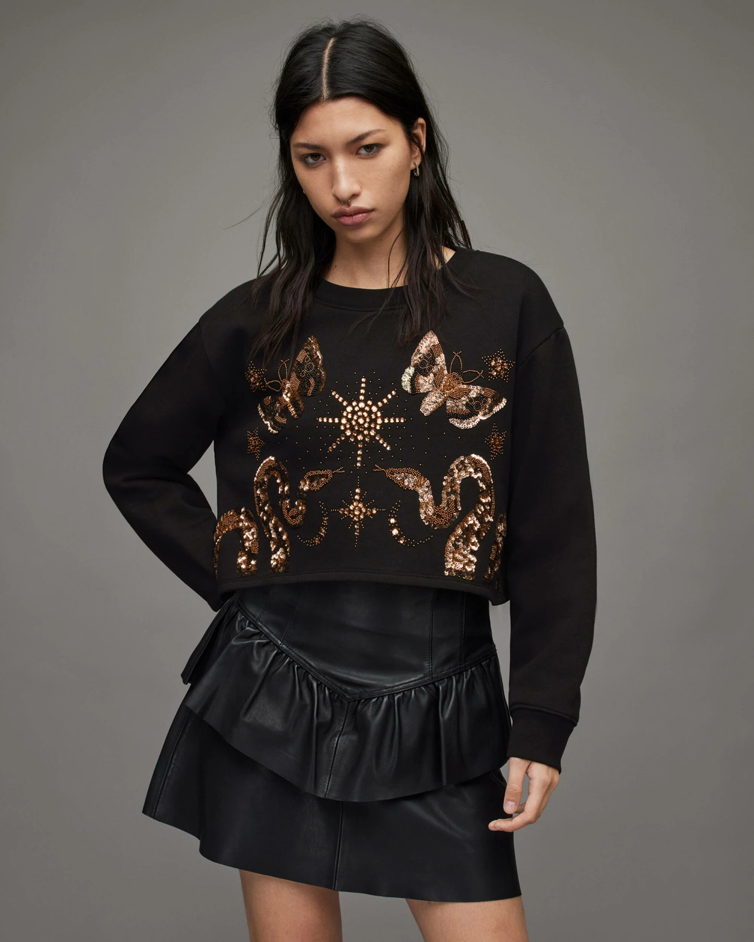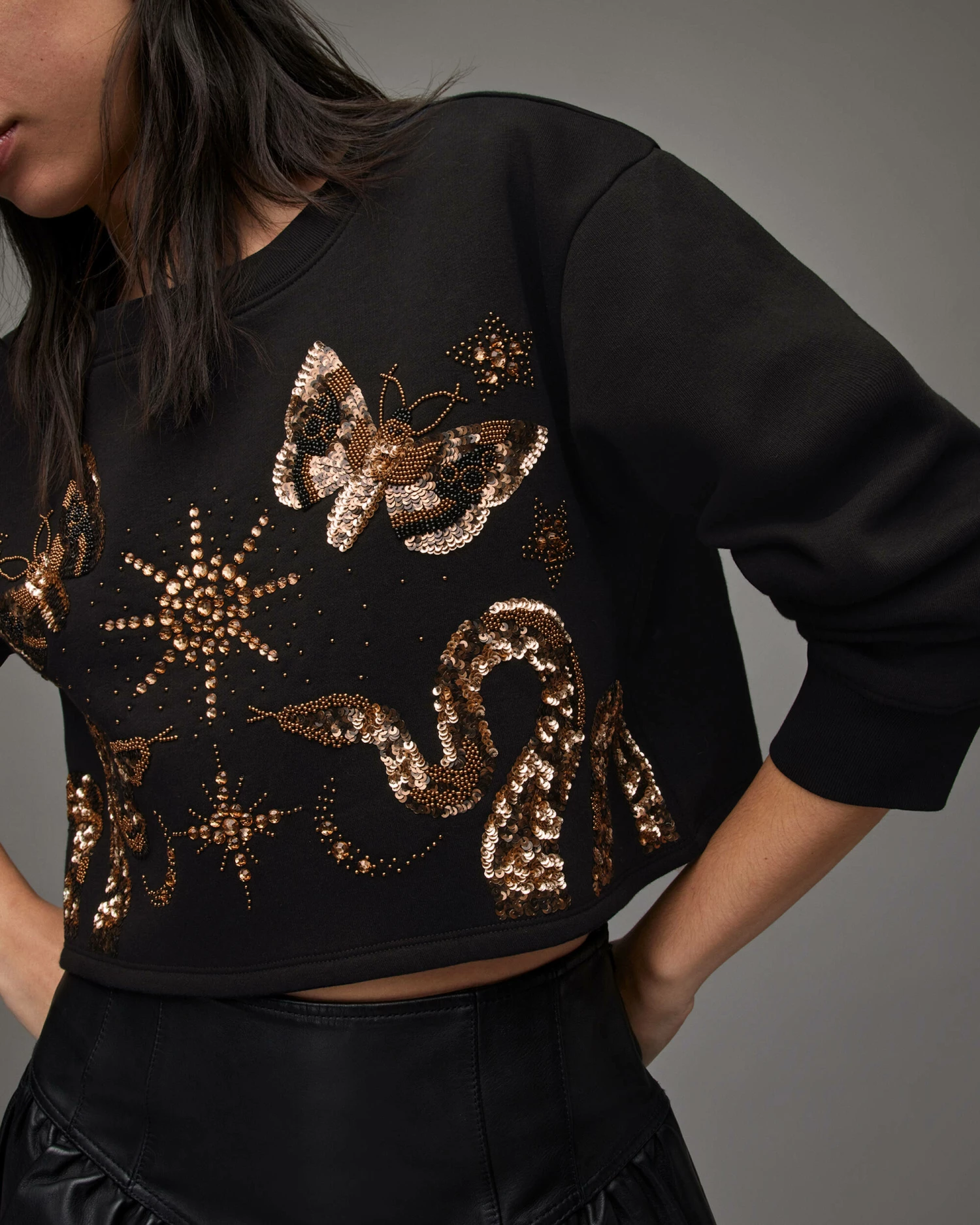 Super comfy and easy to wear. This is the Separo Marina Sweatshirt. It’s shaped to a cropped silhouette. Sequinned embellishment decorates the front – it’s quite the addition.