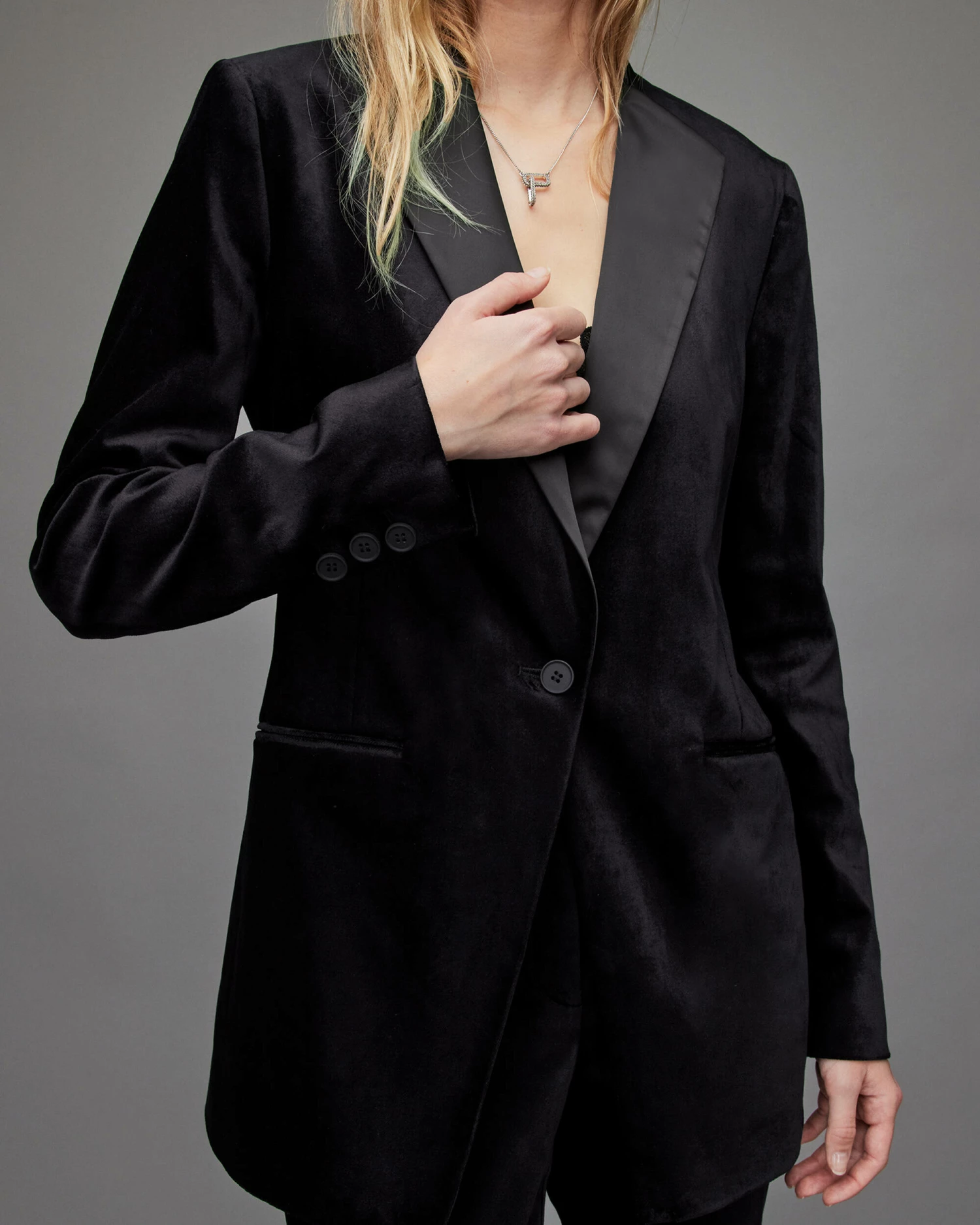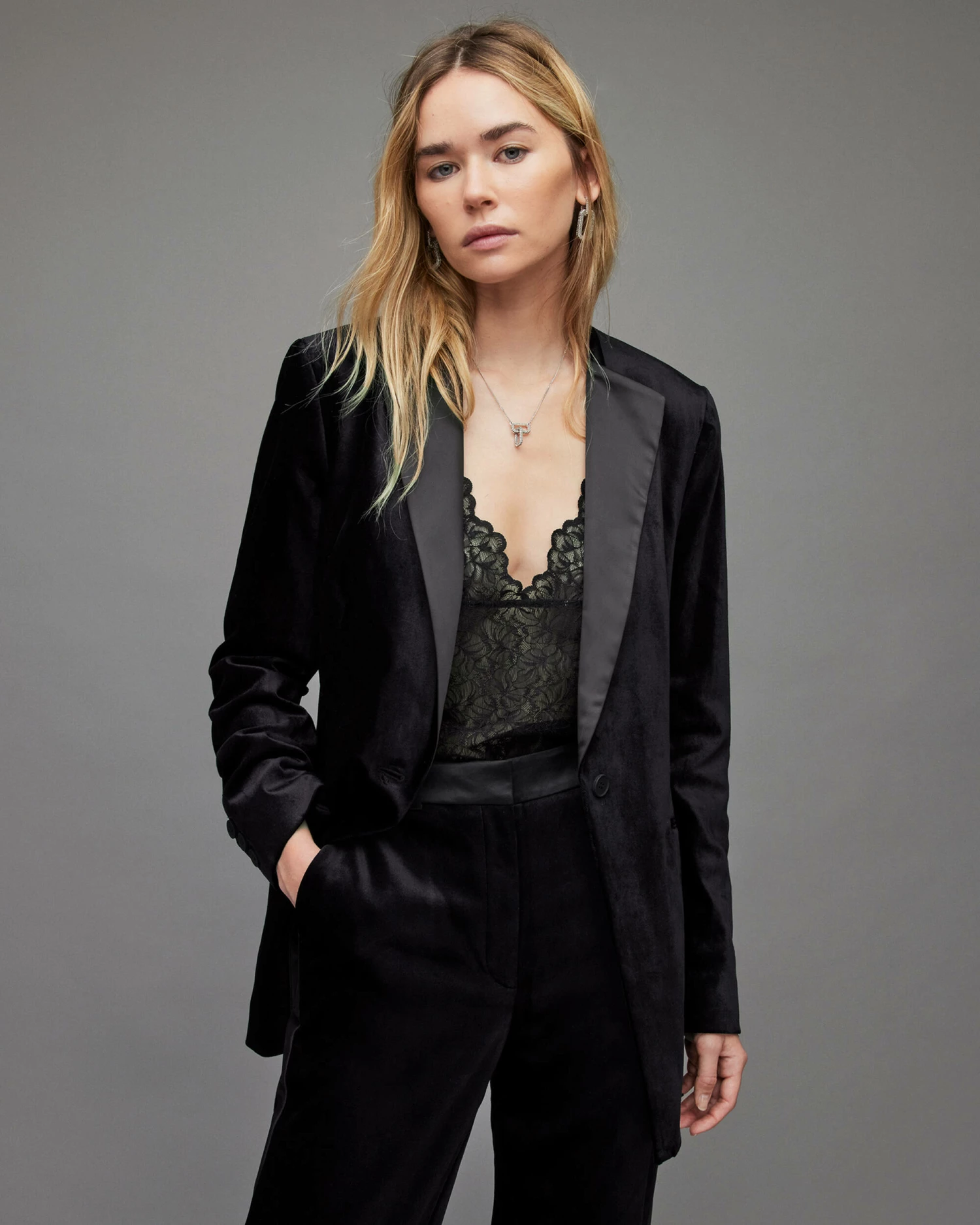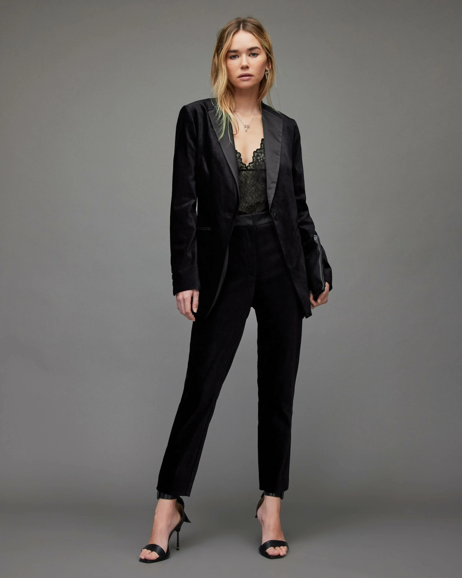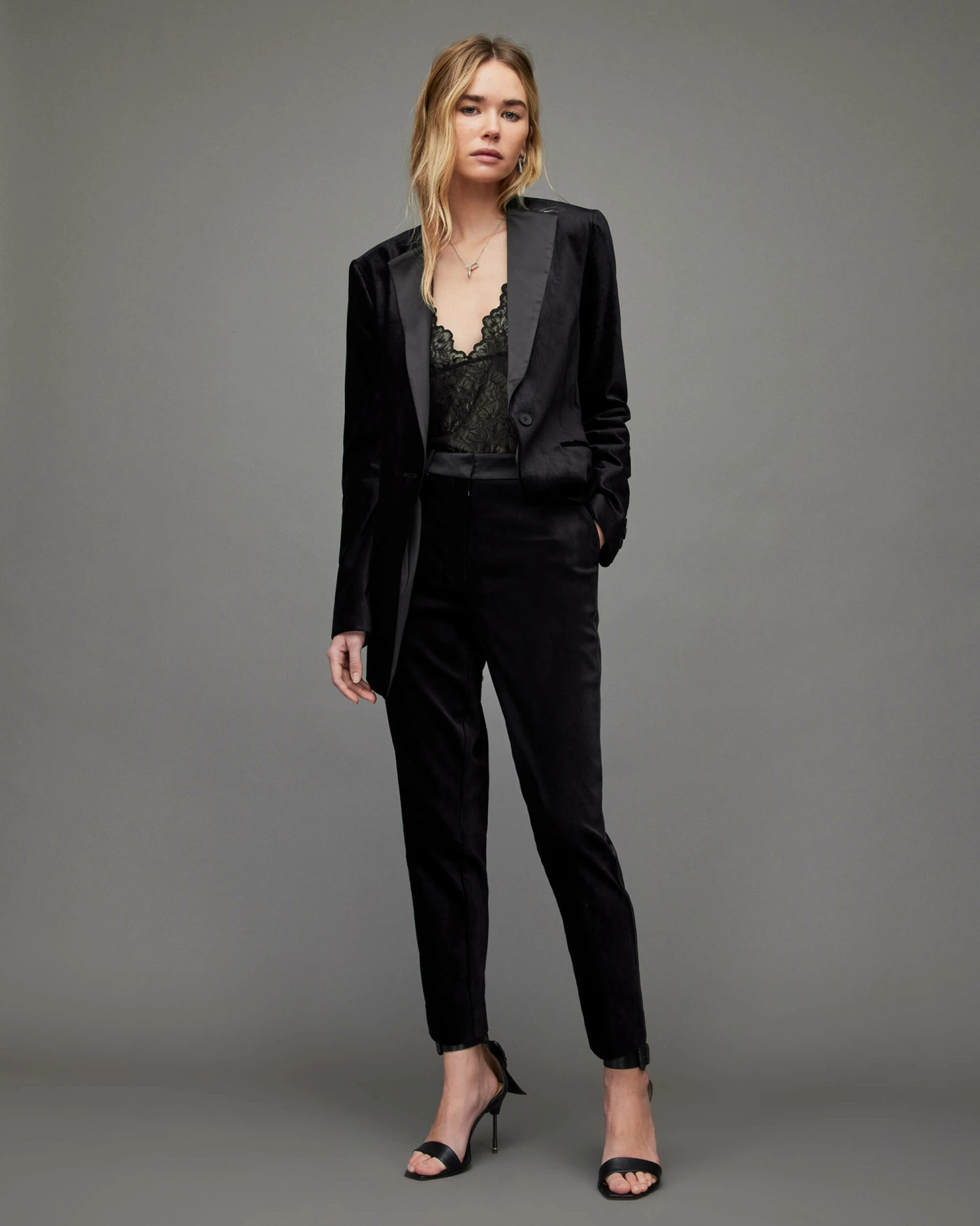 Our tailoring collection just got better. Introducing the Sofia Blazer. The velvet fabric is super comfortable and shaped to a slim silhouette. The satin collar adds a bit of contrast – pair it with the matching trousers for the full look.