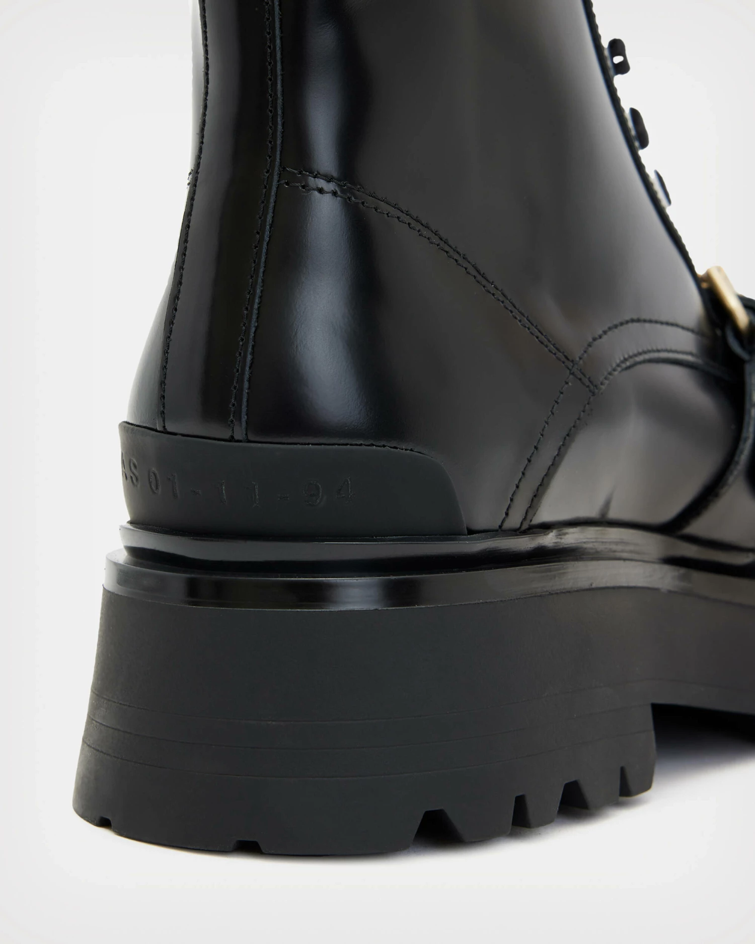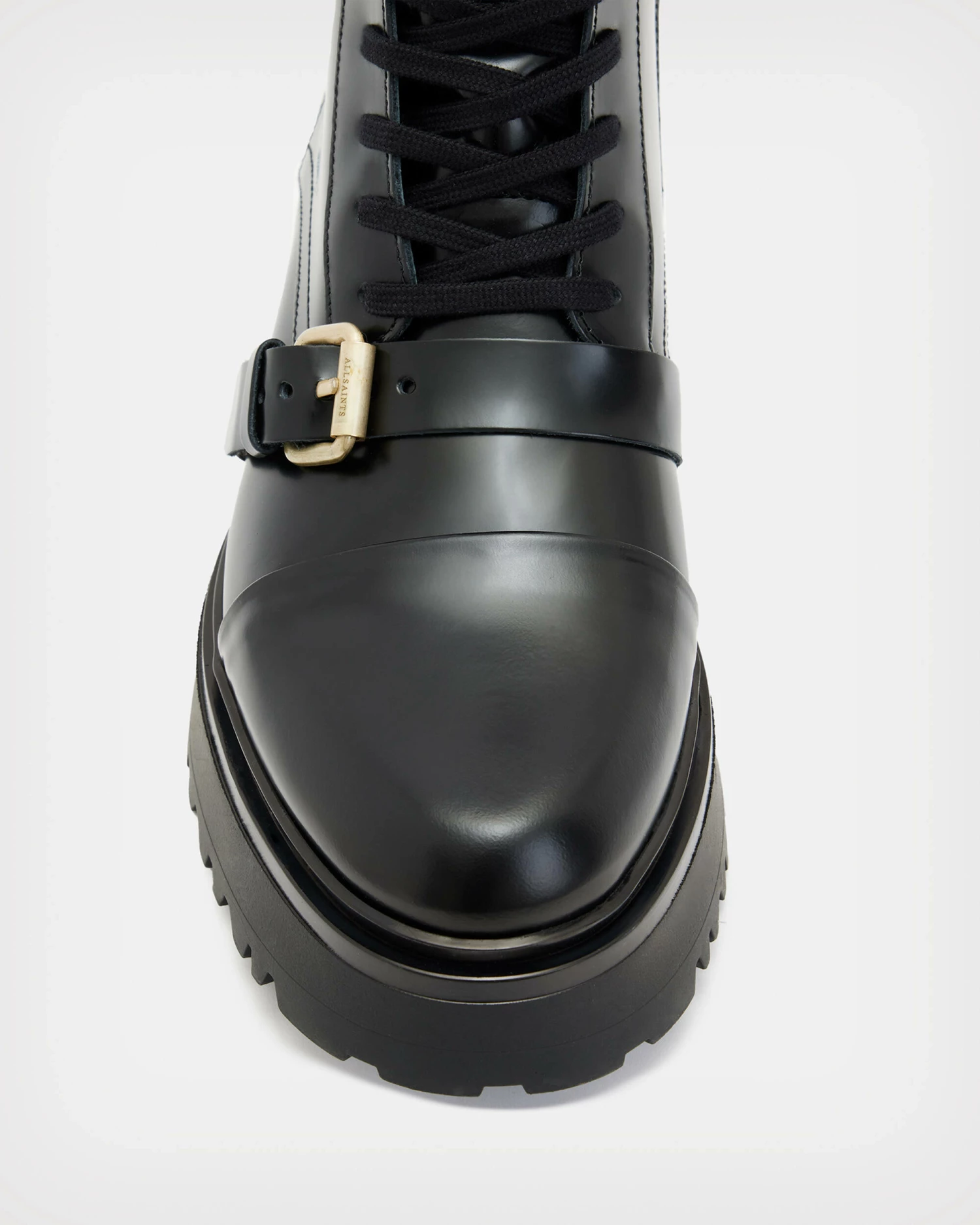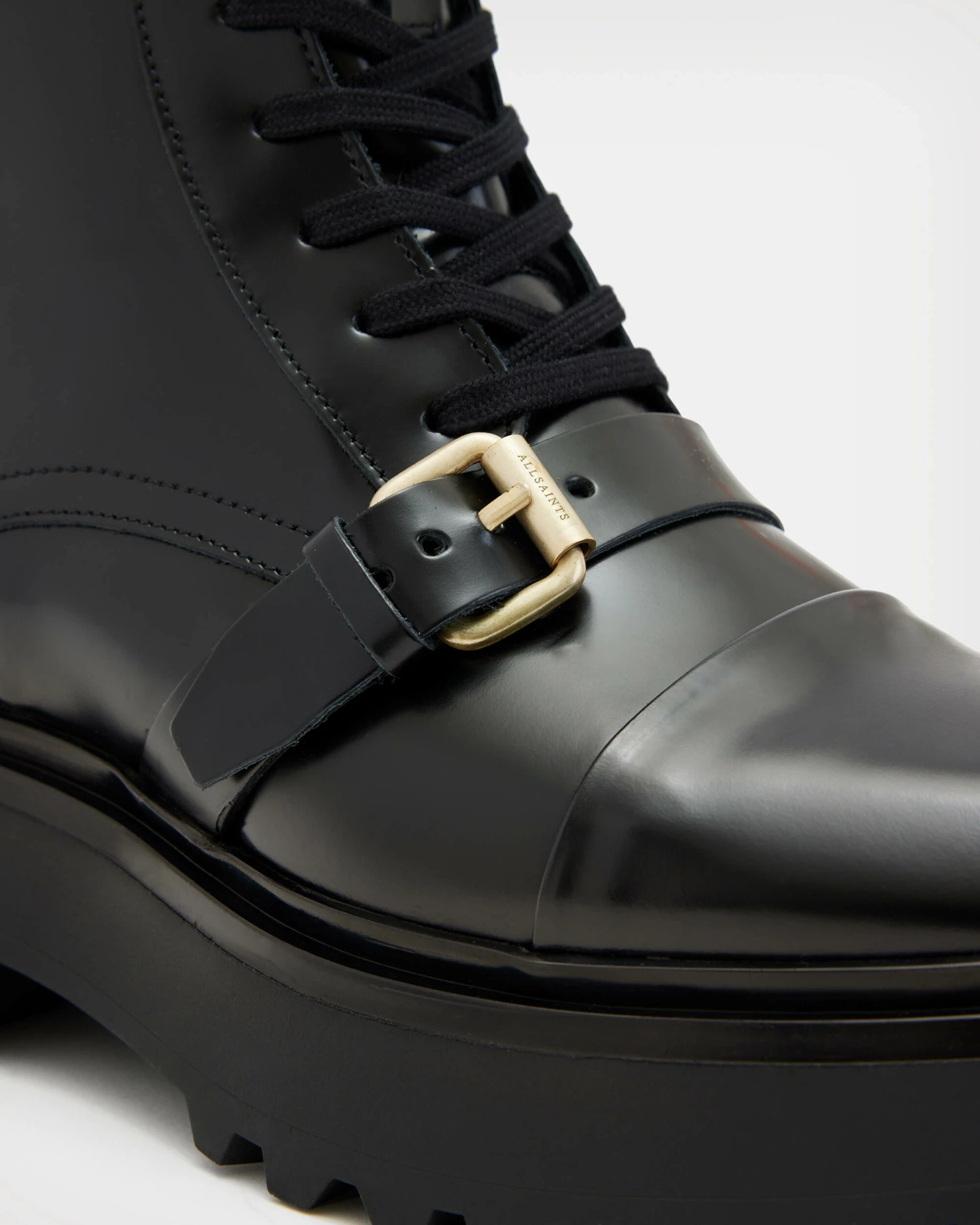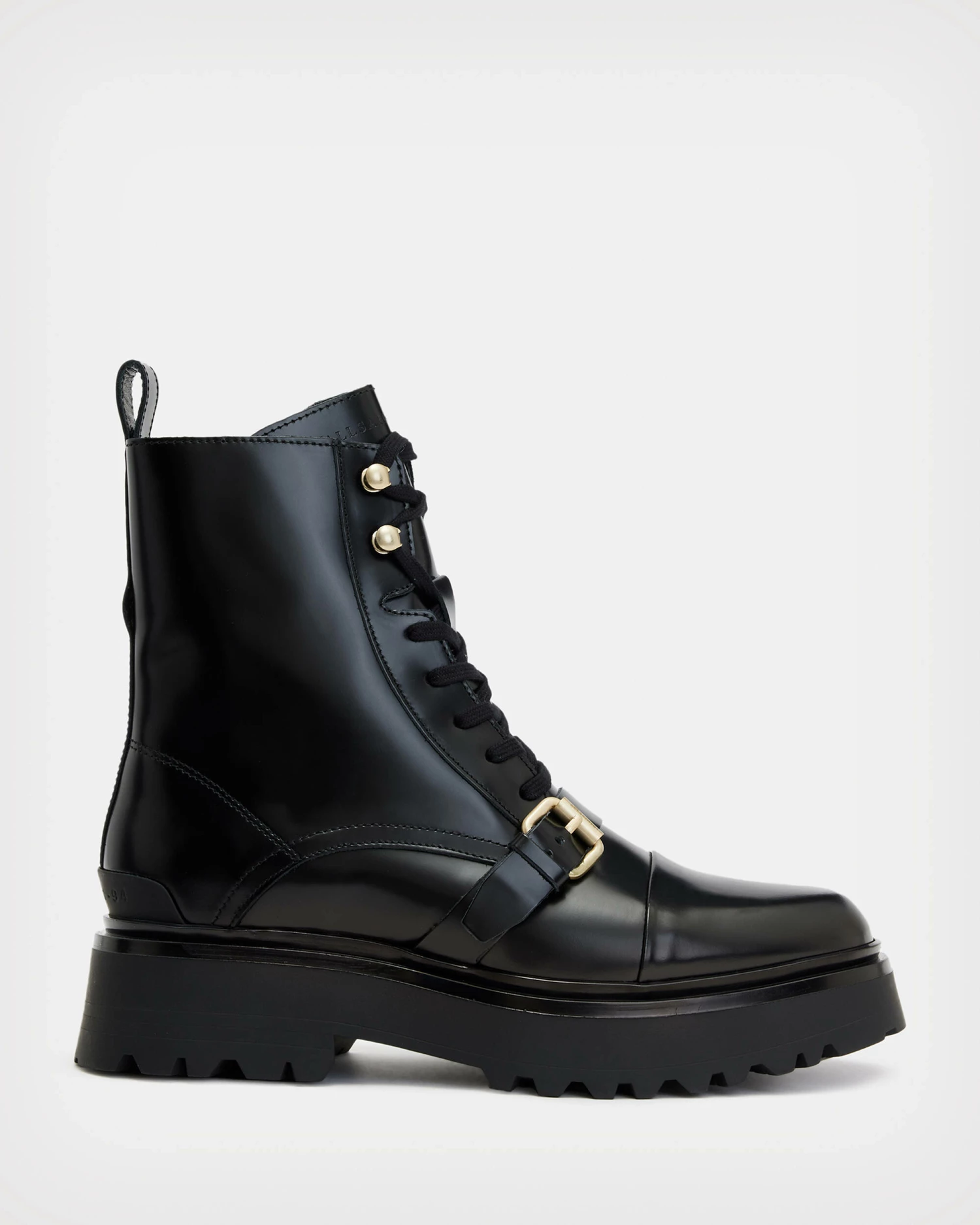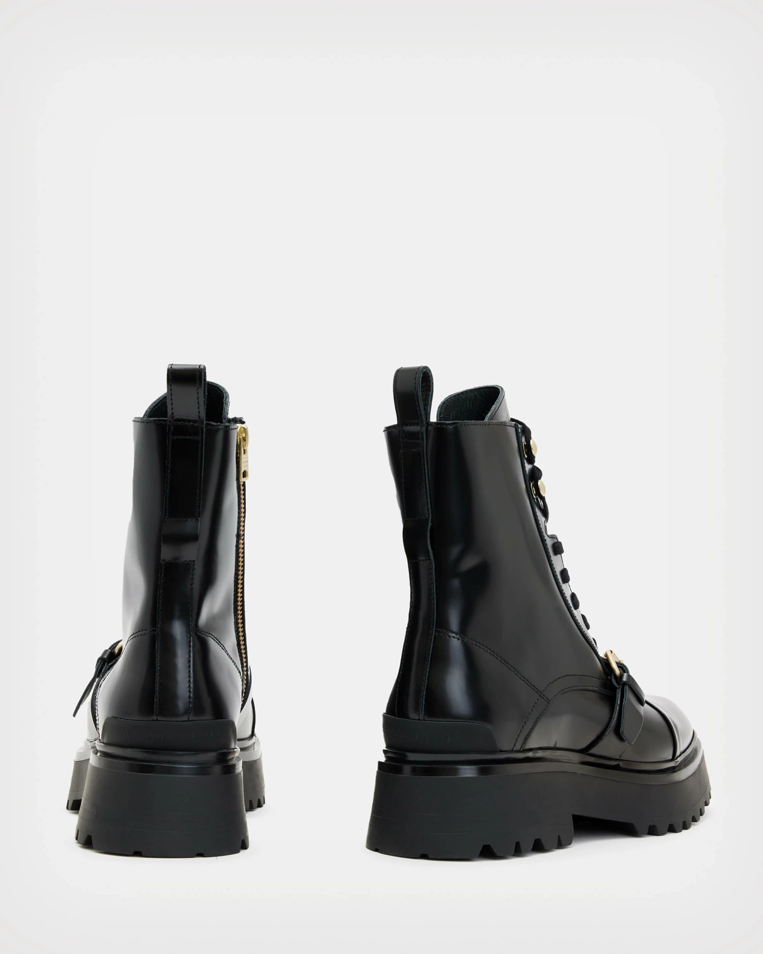 Boots for everyday, with an AllSaints twist. These are called Stellar. Zip and lace closure make them an easy fit. Completed with a gold buckle and chunky rubber heel – they stand out.