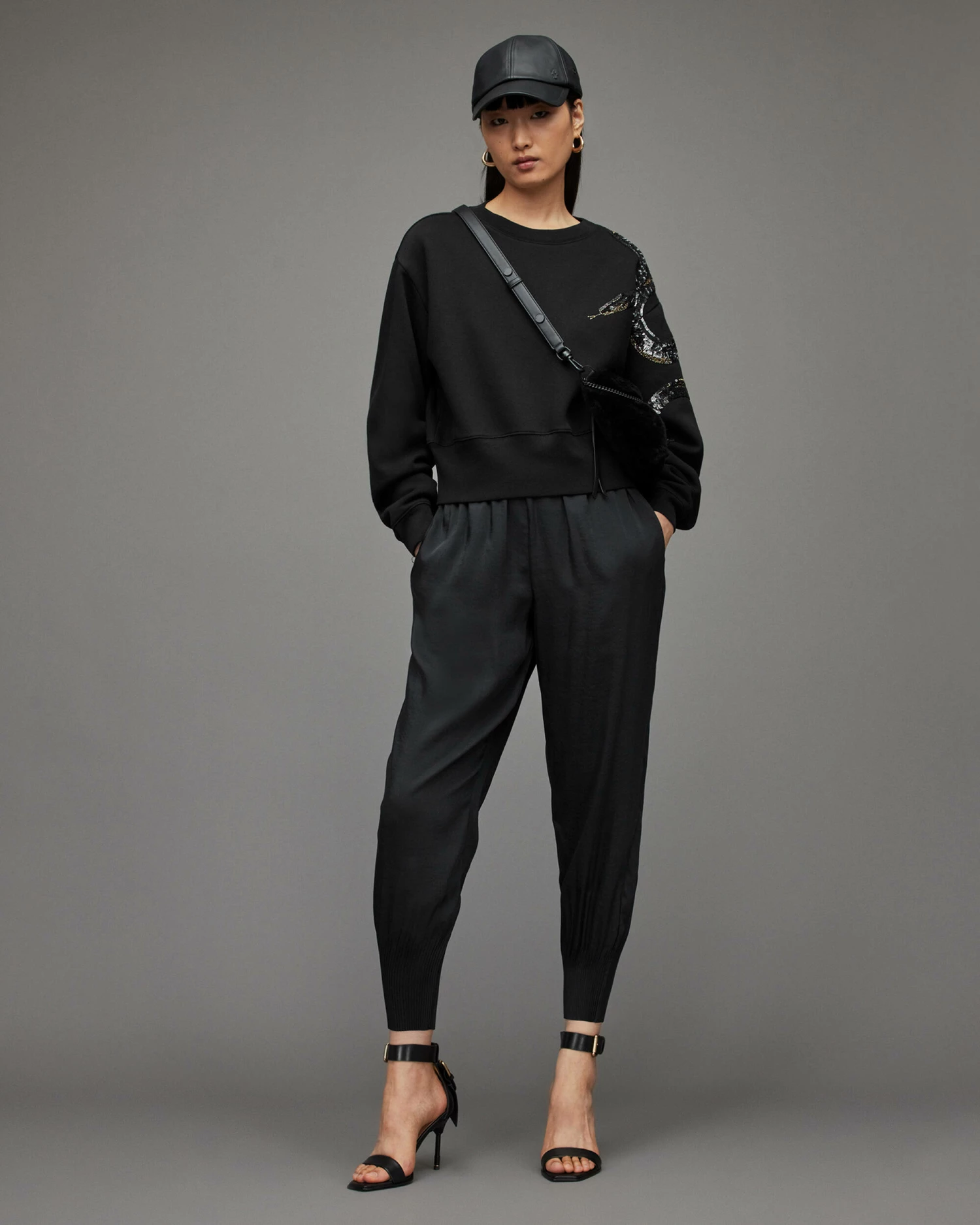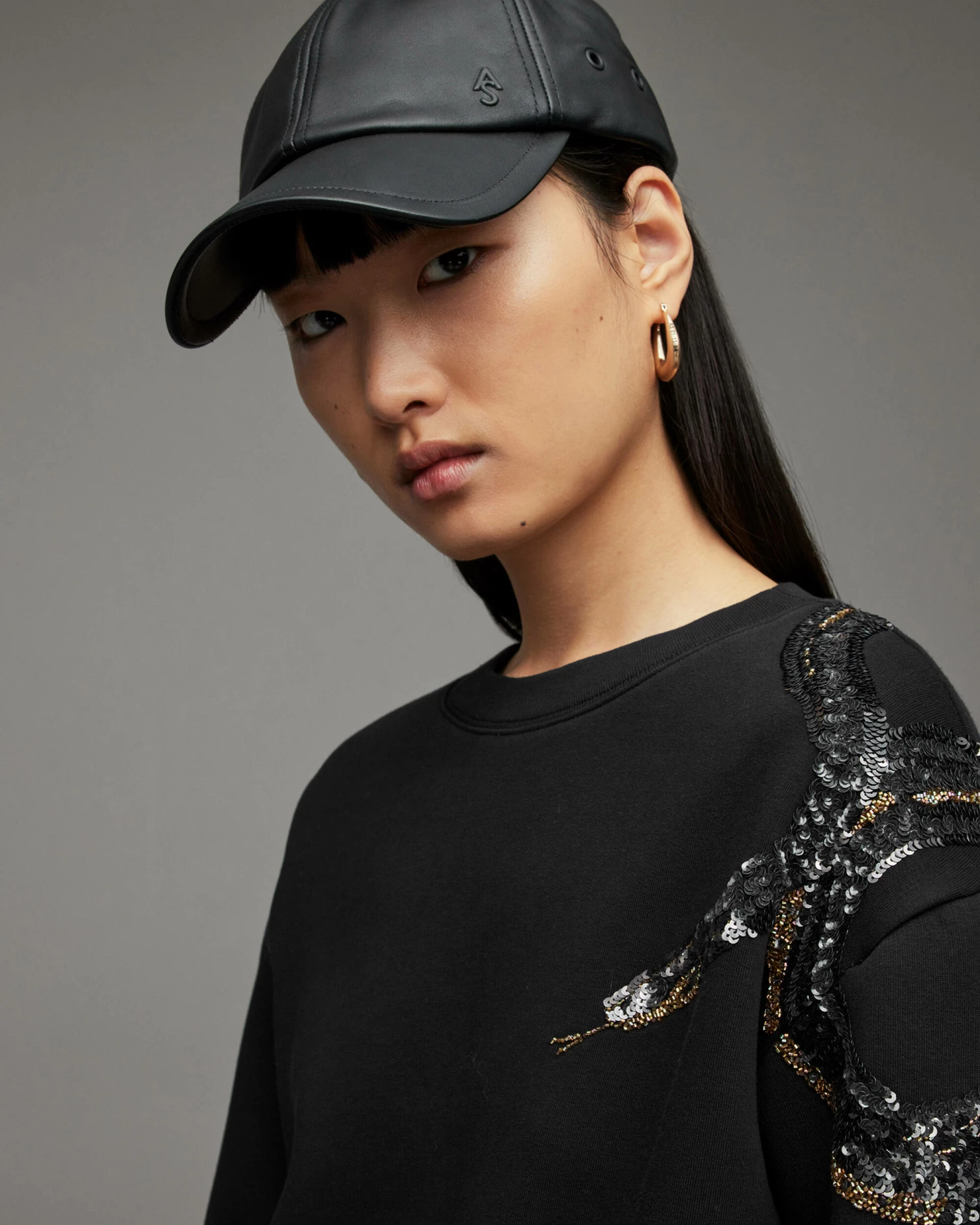 Super comfy and easy to wear. This is the Tempest Separo Sweatshirt. It’s shaped to a relaxed silhouette. The snake embellishment sneaks around the side with sequins – it’s quite the addition.