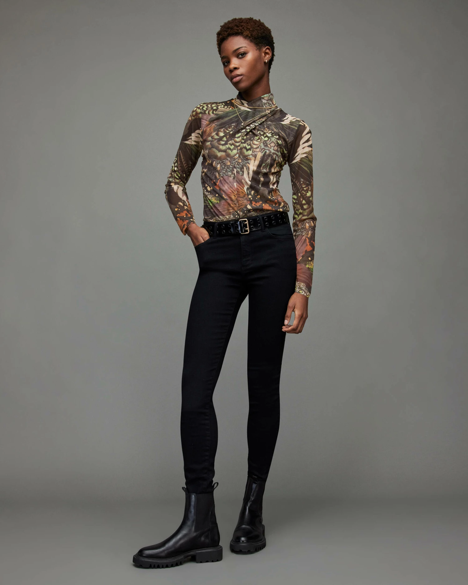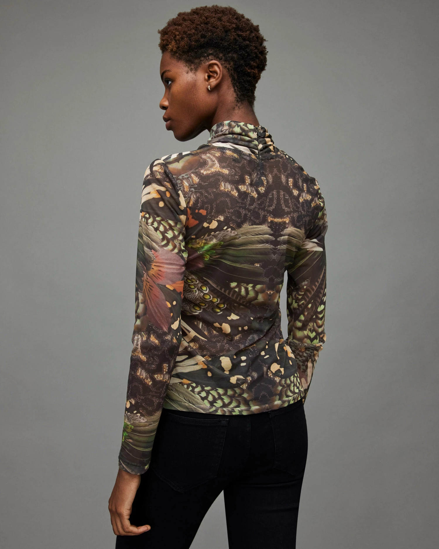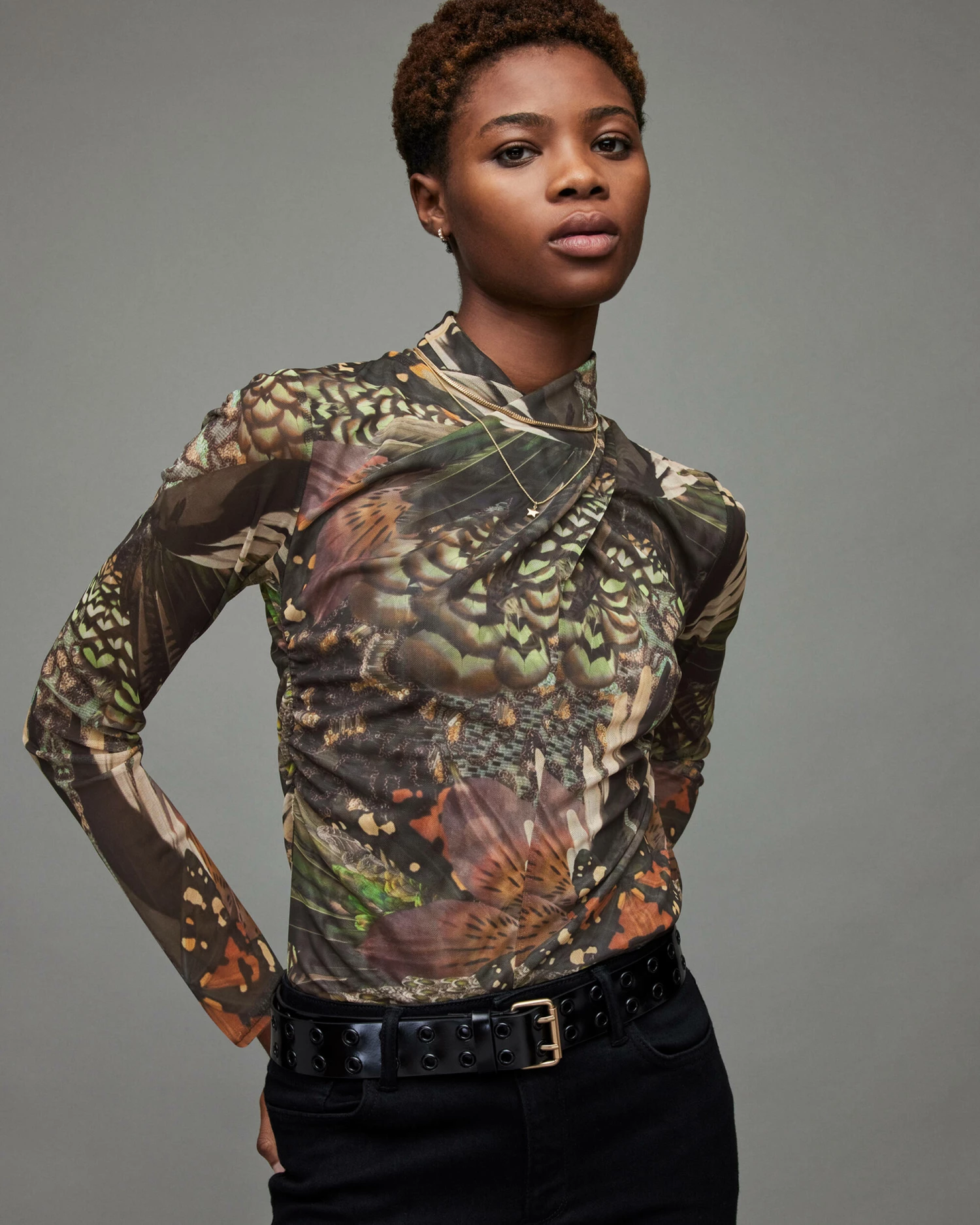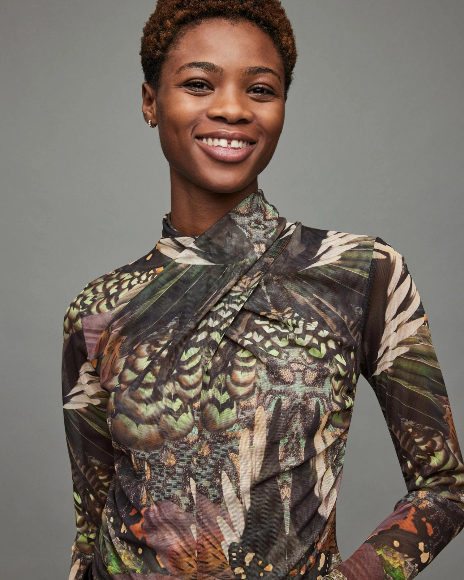 The Tia Gloria Top. It’s a staple style featuring our new season print. The mesh fabrication is cut to a sleek silhouette with long sleeves. Plot twist, check out the wrap over neckline.