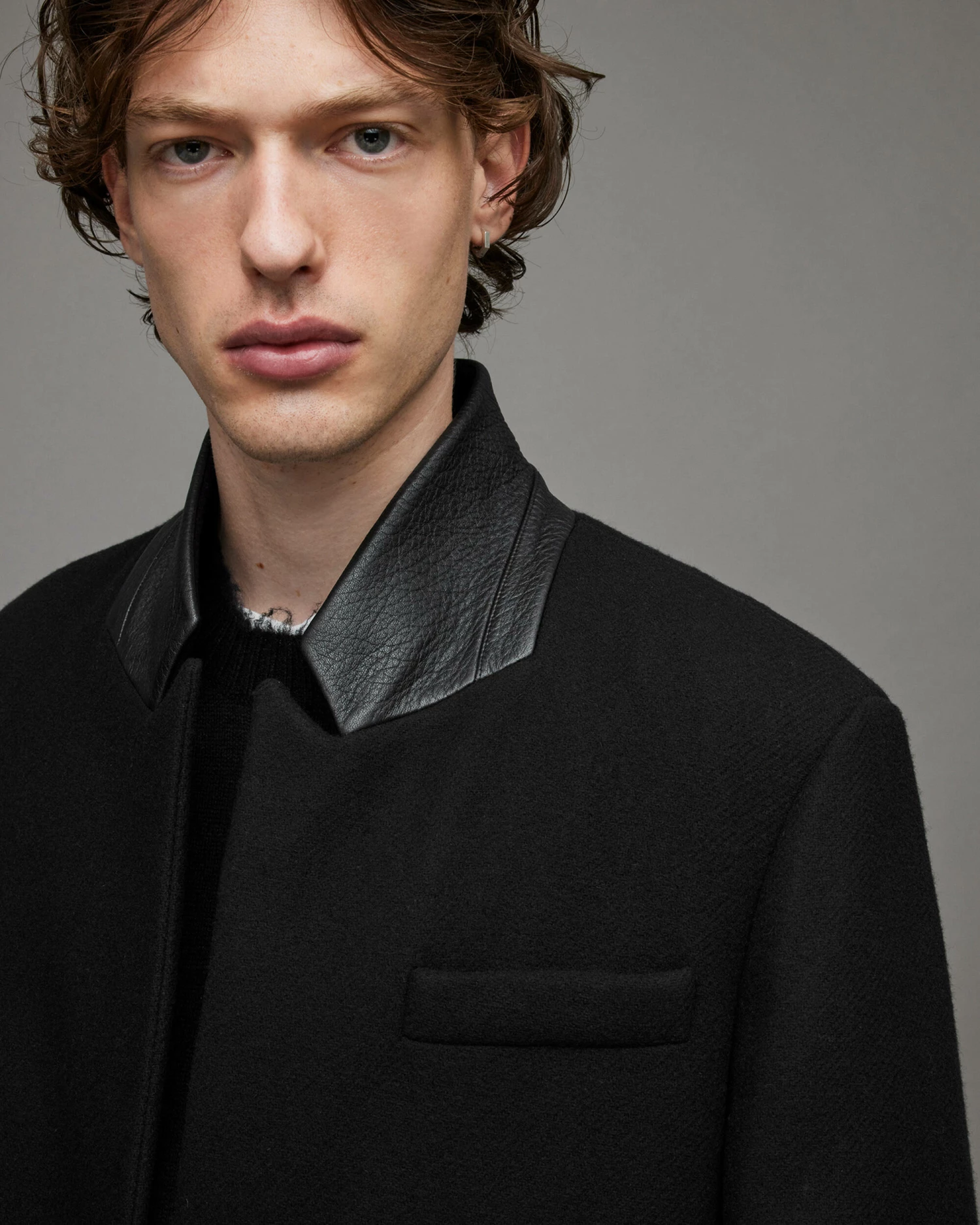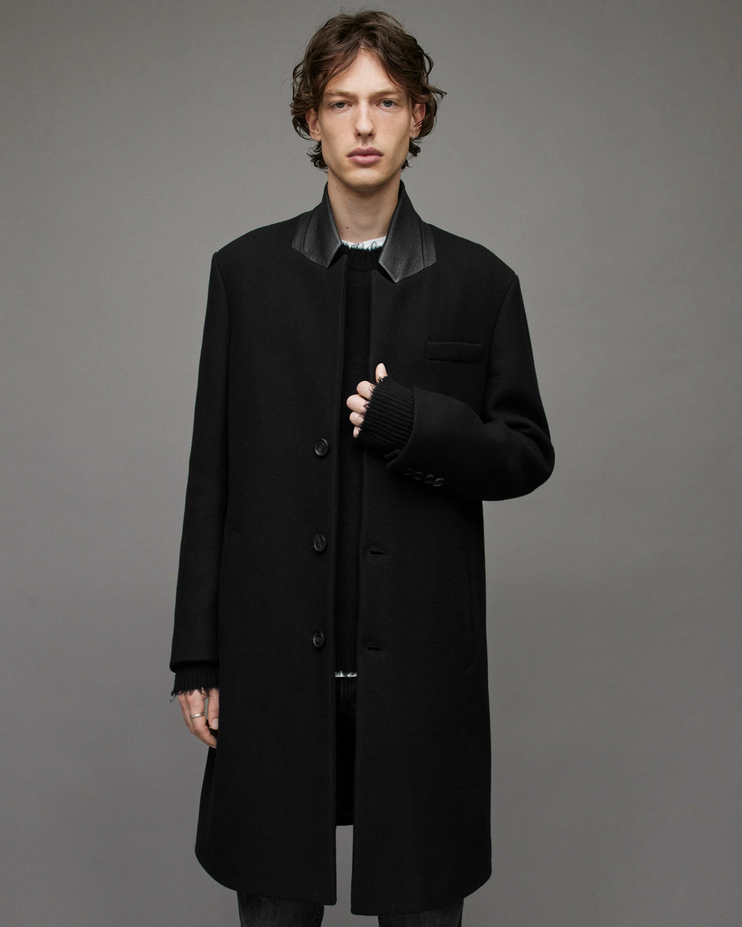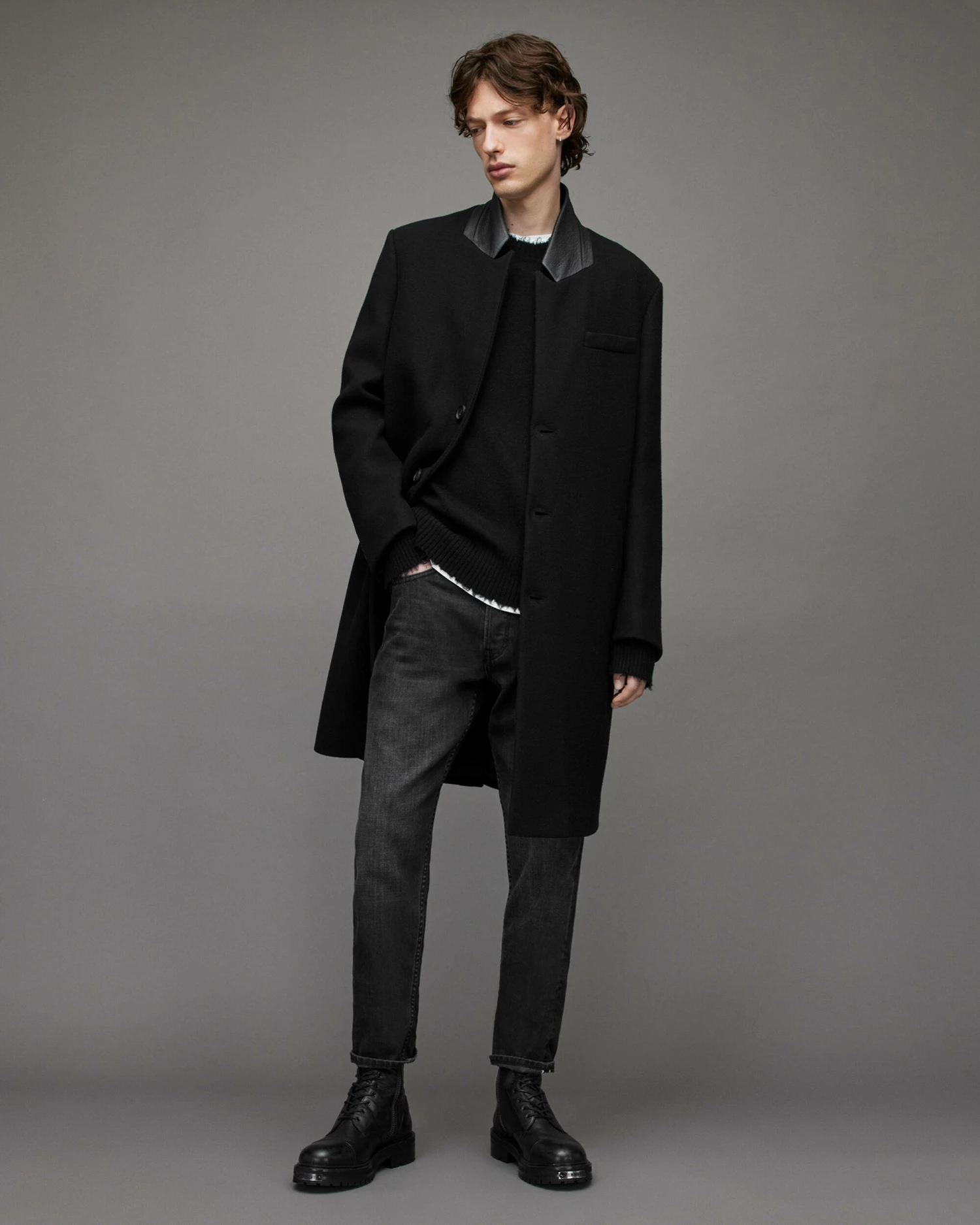 A sophisticated staple. The Truman Coat is shaped to a regular fit from a premium Italian cloth. The stand up collar is leather – that’s the AllSaints edge.