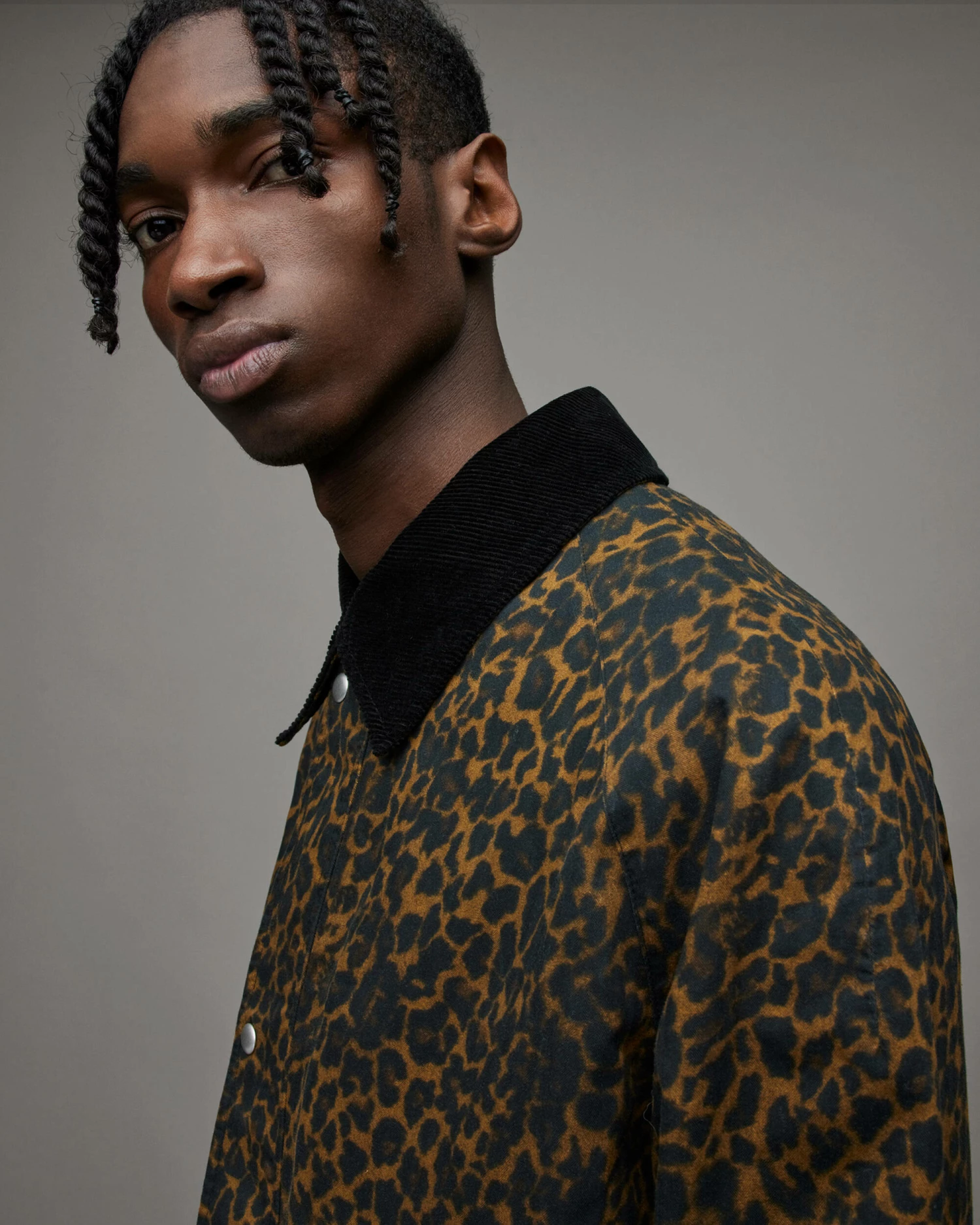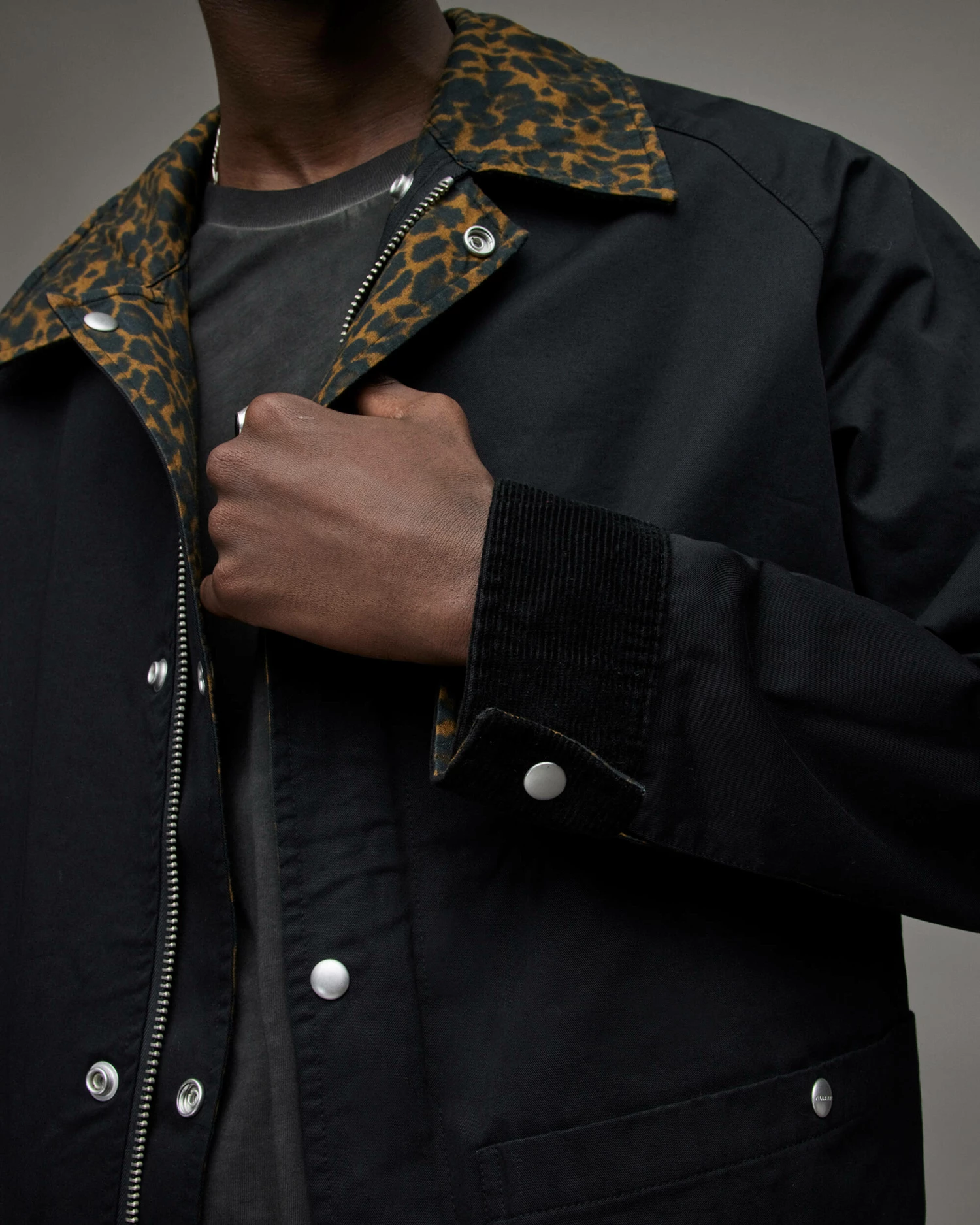 AllSaints. Spitalfields. A whole new attitude. The Vanian Jacket is reversible. Waxed herringbone leopard print on one side and a clean black finish on the other. It has corduroy trims, multiple pockets and a D-ring strap. The cloth is a collaboration with British Mill, Halley Stevensons.
